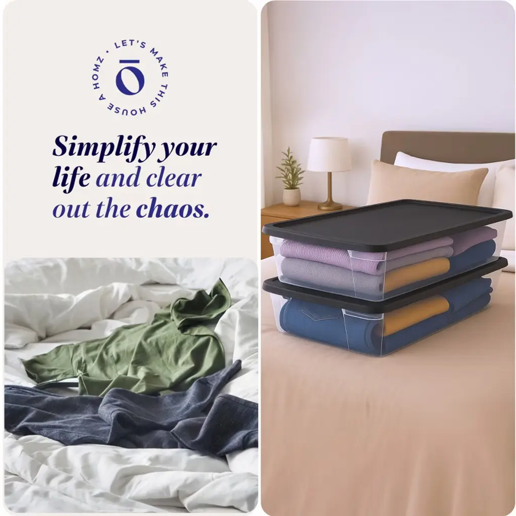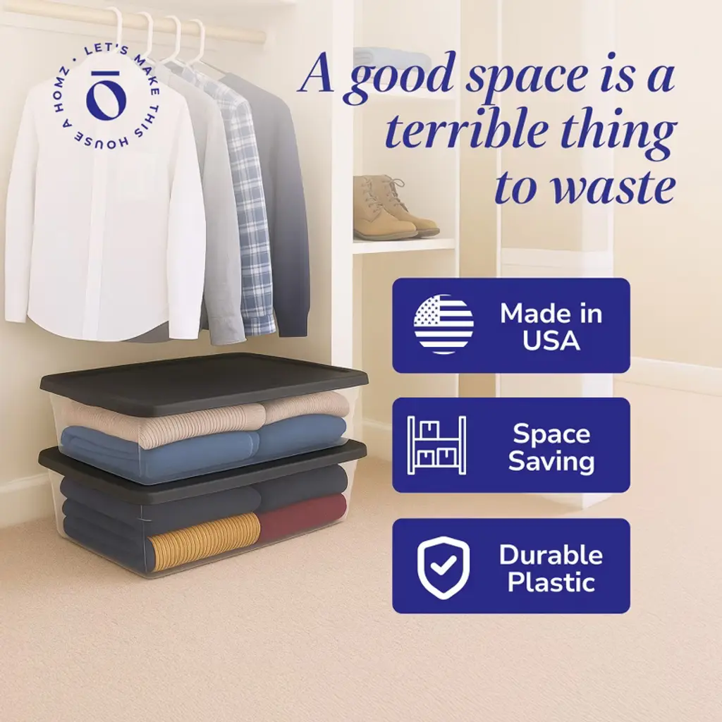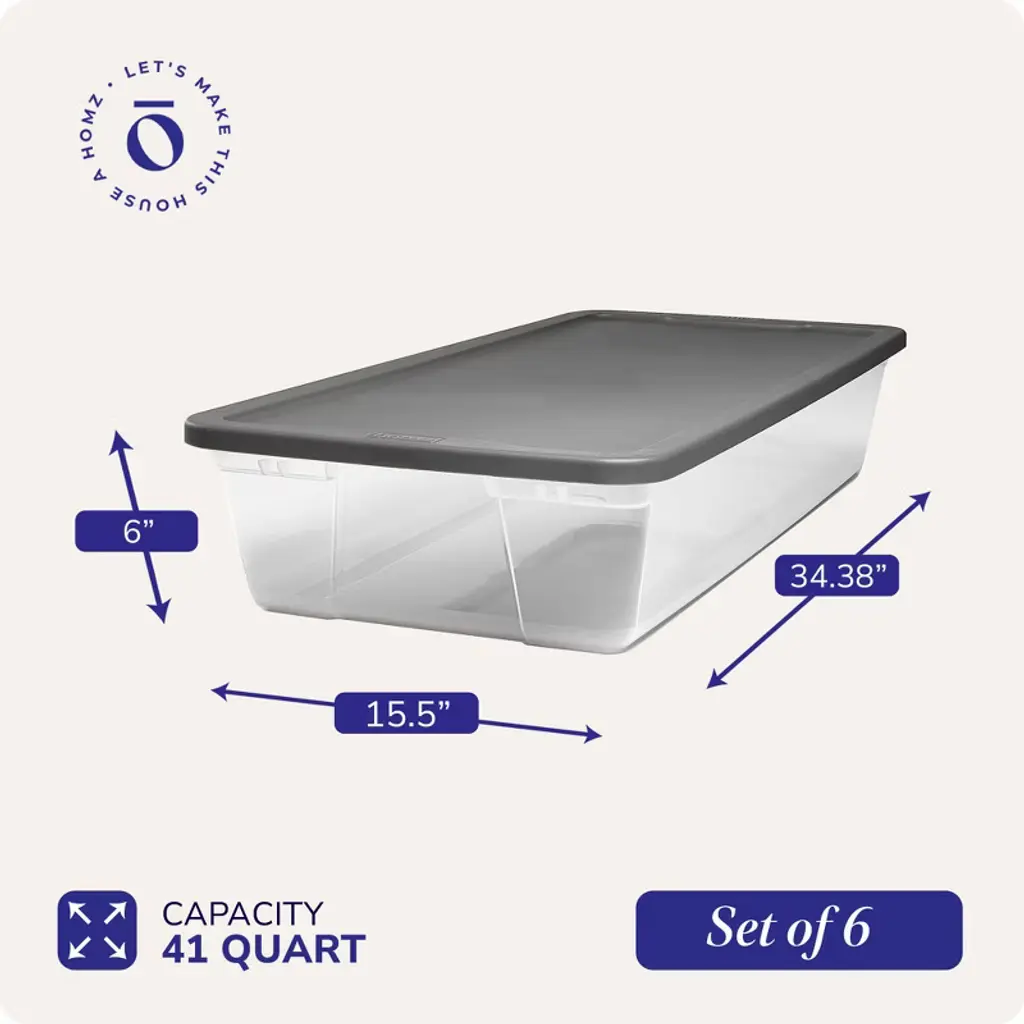 Get the most out of your space with the 6-pack of Homz Plastic Storage Containers. Ideal for storing away holiday decor, shoes, office supplies, kitchen utensils, and so much more, the opportunities with these totes are endless. Featuring secure latching lids, these storage containers offer a robust safeguard, guaranteeing the confinement of your personal items in a dry and secure environment, effectively shielding them from dust and debris. The clear design makes these containers even better. You can easily see what's inside without opening them, which saves time looking for things. This feature helps you find items quickly and keeps your storage organized. Profoundly indented lids enable secure stacking, optimizing vertical storage capacity in your kitchen, bathroom, and closet. Bins fit snugly when stored away, promoting efficient organization. The modular design optimizes storage space, allowing you to stack and nest each bin on top of the other. Ideal for bathroom, kitchen, or off-season storage, crafted from robust, high-strength plastic, these storage containers are designed for extended and enduring utility. Each bin has interior dimensions of 12.66 inches long by 29.68 inches wide by 5.53 inches tall and an exterior dimension of 15.5 inches long by 34.38 inches wide by 6 inches tall. Take your organization skills to the next level with the 6 Plastic Storage Containers from Homz.