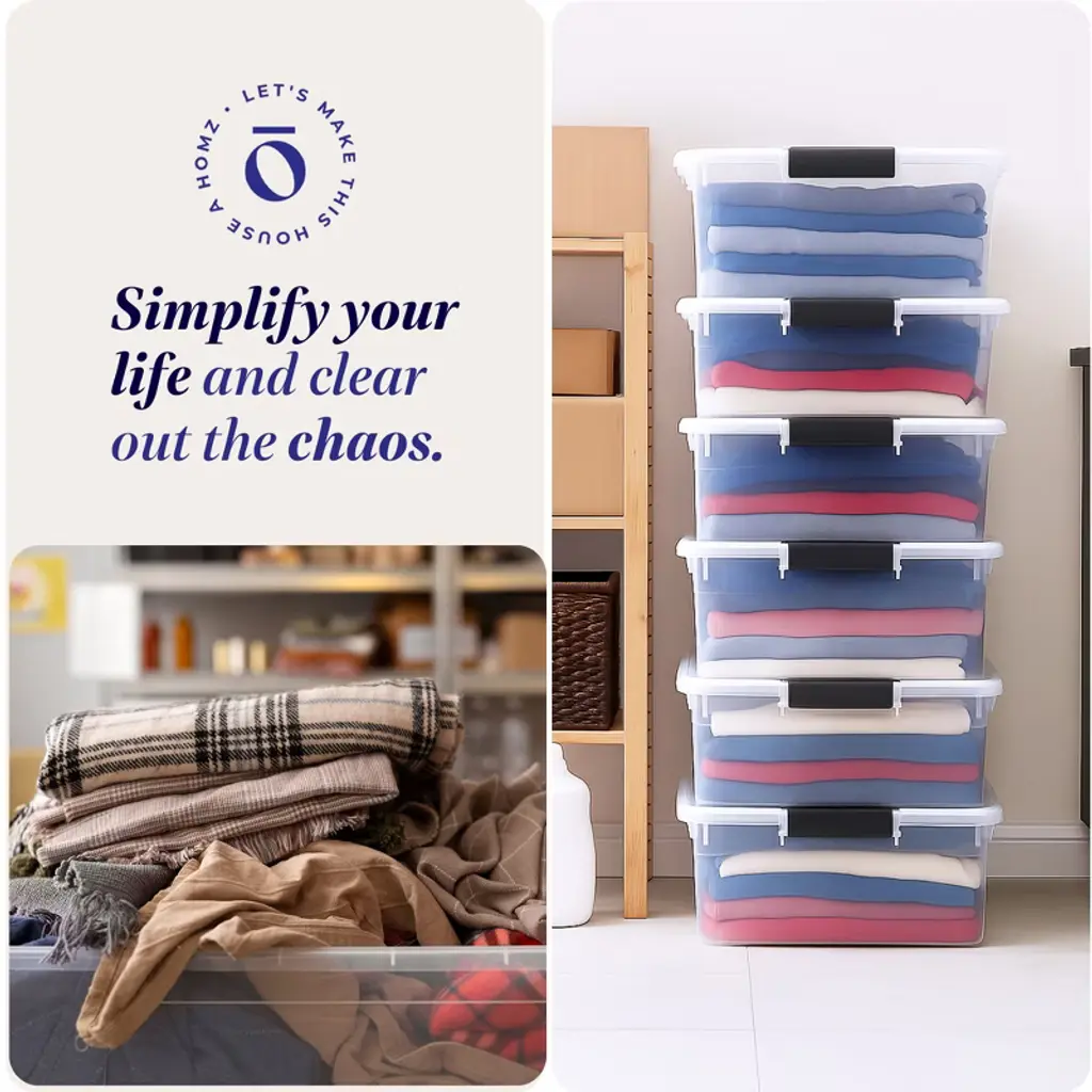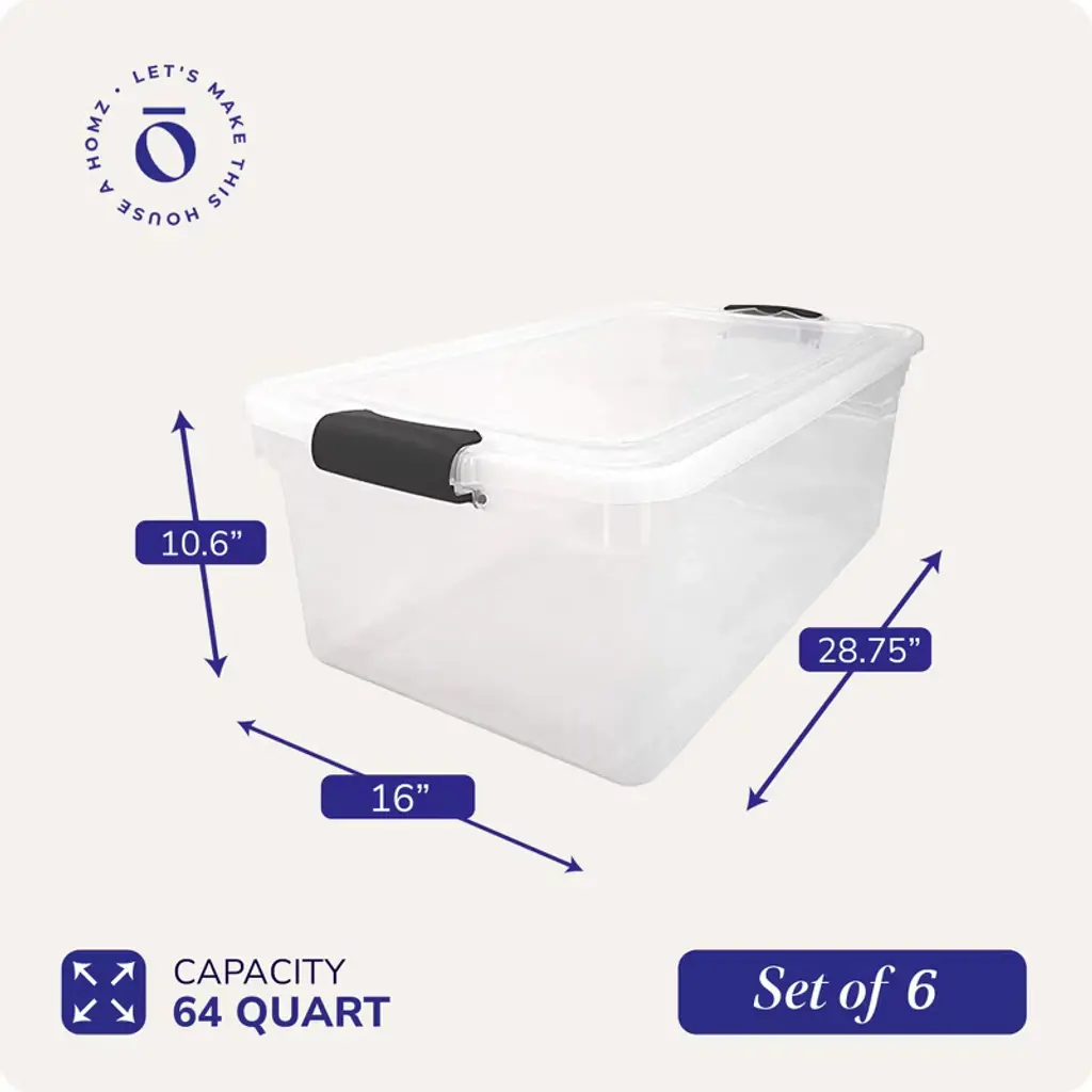 Enjoy getting organized with the 6 pack of Stackable Storage Containers from Homz. Ideal for a variety of basic household needs, these 64-quart versatile bins can be used to store clothing items, toys, sporting equipment, seasonal decor, crafts supplies, and more. The ergonomic latching handles lock to secure the lid providing a secure, comfortable grip for easy carrying. When locking, the lid snaps firmly into place to ensure all contents stay contained, concealed, and dust-free. Featuring the indexed surface of the lid, these storage totes can stack neatly on top of each other for efficient use of vertical storage space. Built with durable see-through plastic materials, you're able to see the contents inside without opening the container for an efficient find. The classic styling offers a refreshing, clean, and coordinated look. Whether it's the rooms in your house, the garage, or office space, neatly pack away your things in the 6 Storage Container Organizer Bins from Homz.