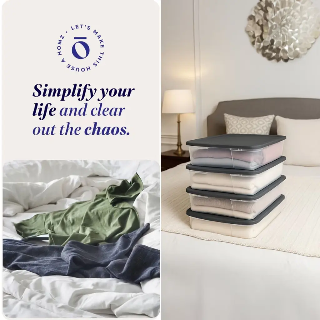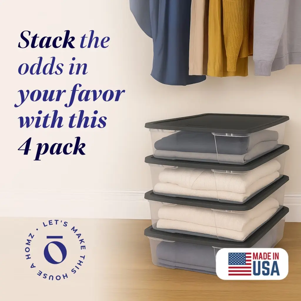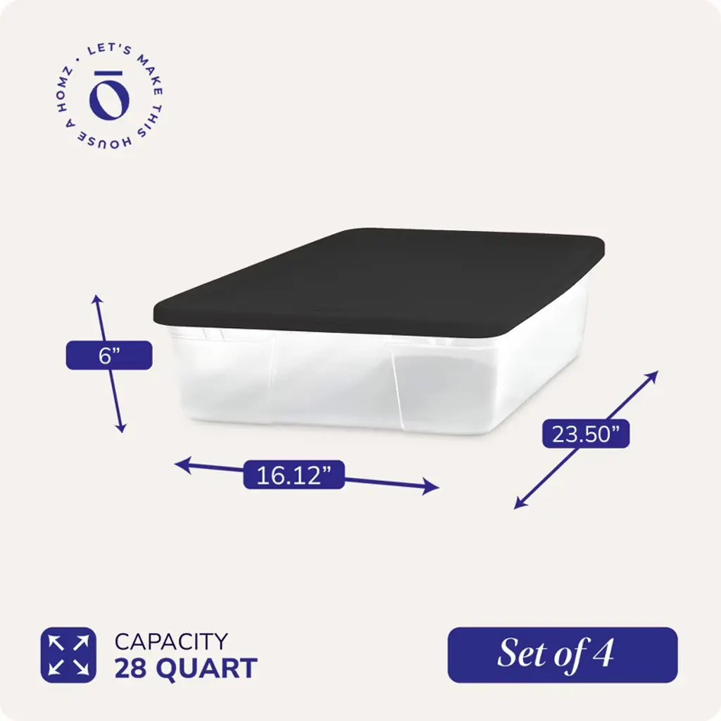 Introducing the HOMZ 28-Quart Plastic Storage Bins, the superhero squad of organization that will help rescue cluttered small spaces. These tote bins for storage with lid come in a set of 4 versatile containers that are great for corralling small-sized essentials from office supplies to kitchen utensils and seasonal decorations. Each 28-quart container is like a tiny organizing wizard, waving its wand of tidiness to create an out-of-the-way smart storage system for playrooms, closets, offices, and garages alike. Use this set to unleash the power of organization, and watch your clutter disappear like magic! It is a match made for an underbed organizer, a small room clothes storage, small apartment storage solutions, college dorm room essentials, or just an overall household organization upgrade. These room storage and organization bins are equipped with snap-on latching lids and integrated handles, ensuring a secure seal and effortless portability between different areas. They feature sturdy, transparent plastic construction, so you never have to play a guessing game about what you stored in each tub. And the magic doesn't stop there! These flat plastic storage bins have indexed lids designed for tidy stacking or nesting, helping you optimize your space to reduce clutter even more. HOMZ believes that no clutter should be left behind. Our wide collection of organizers and storage cabinets is durable, efficient, space-saving, and some would even say sexy. Pick up a few containers to tame your worst mess and bring order to the chaos.