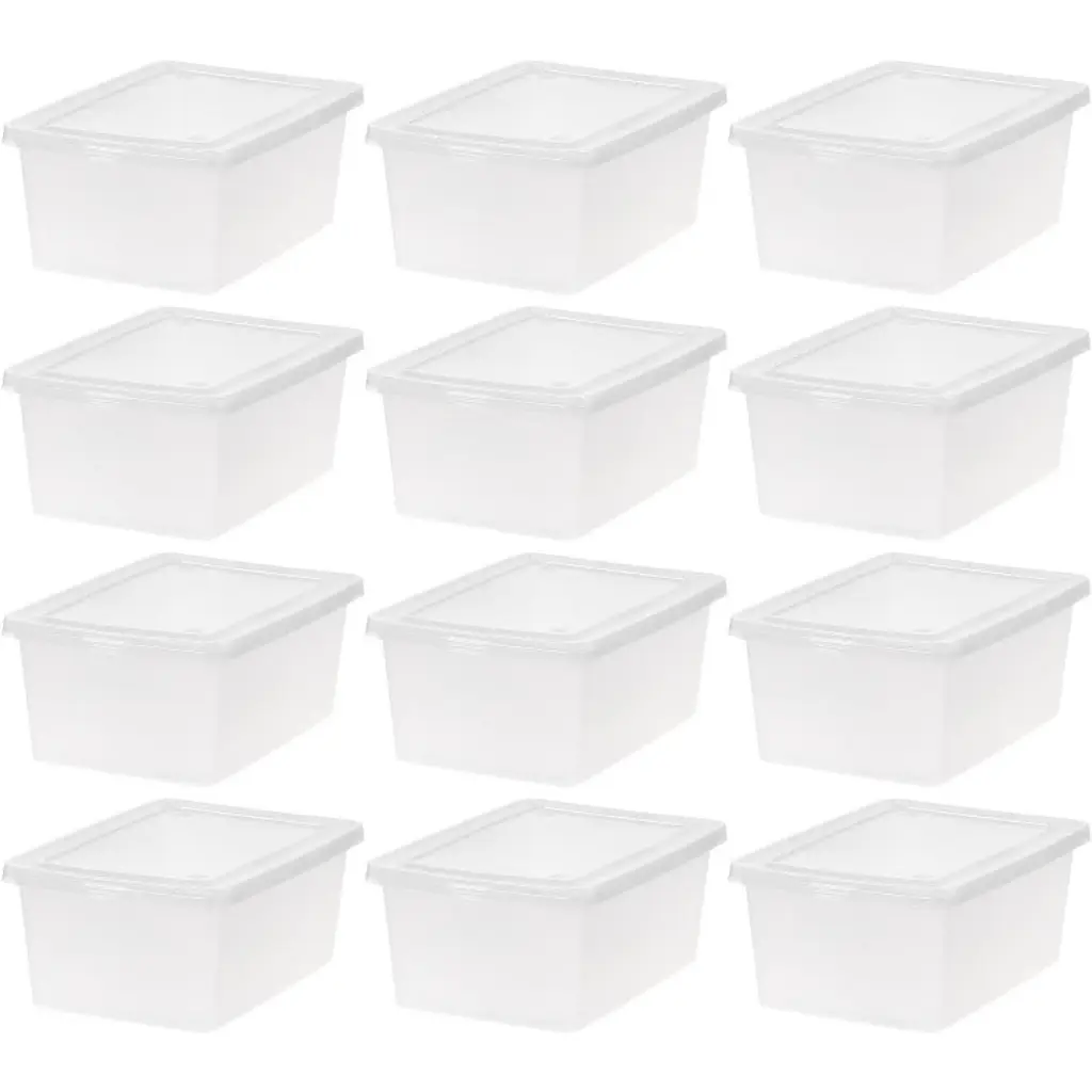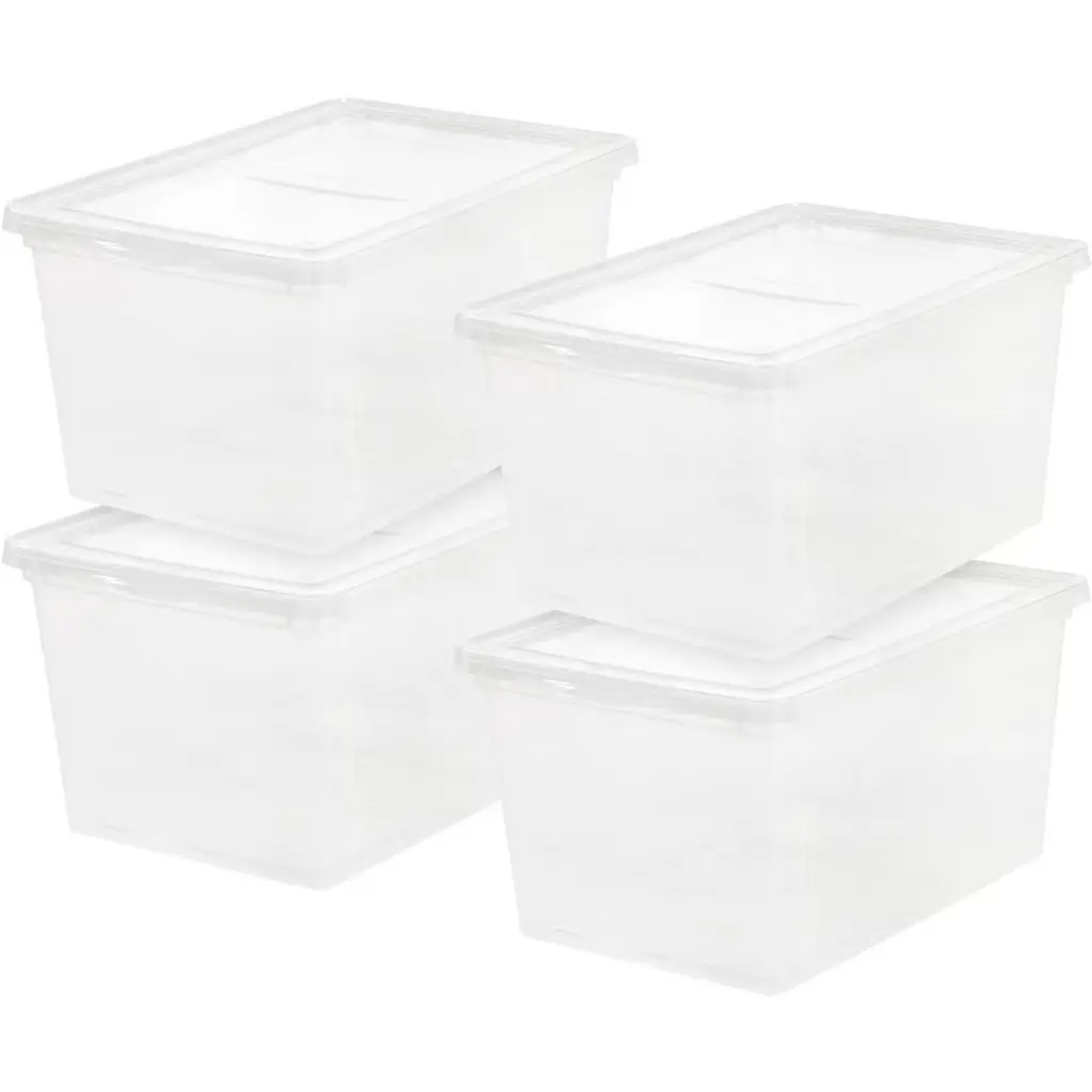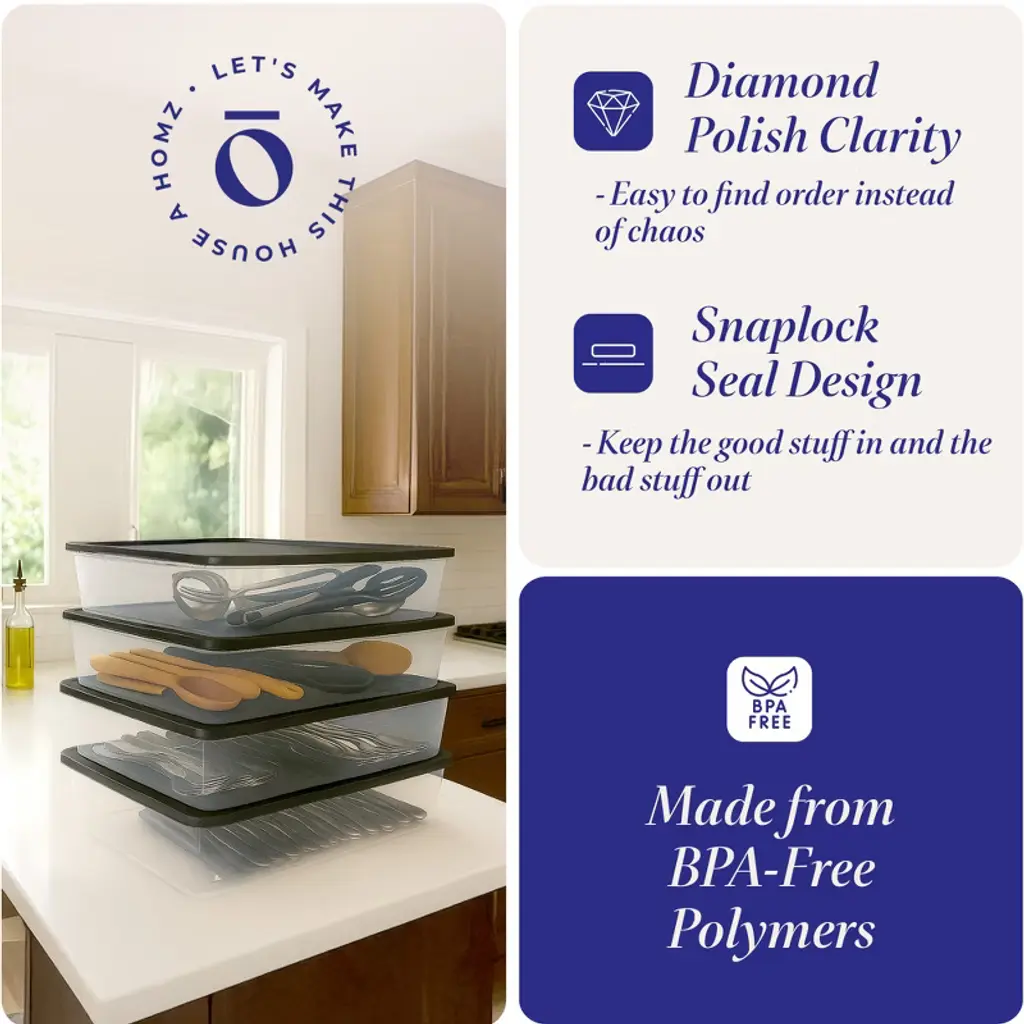 Introducing the HOMZ 28-Quart Plastic Storage Bins, the superhero squad of organization that will help rescue cluttered small spaces. These tote bins for storage with lid come in a set of 4 versatile containers that are great for corralling small-sized essentials from office supplies to kitchen utensils and seasonal decorations. Each 28-quart container is like a tiny organizing wizard, waving its wand of tidiness to create an out-of-the-way smart storage system for playrooms, closets, offices, and garages alike. Use this set to unleash the power of organization, and watch your clutter disappear like magic! It is a match made for an underbed organizer, a small room clothes storage, small apartment storage solutions, college dorm room essentials, or just an overall household organization upgrade. These room storage and organization bins are equipped with snap-on latching lids and integrated handles, ensuring a secure seal and effortless portability between different areas. They feature sturdy, transparent plastic construction, so you never have to play a guessing game about what you stored in each tub. And the magic doesn't stop there! These flat plastic storage bins have indexed lids designed for tidy stacking or nesting, helping you optimize your space to reduce clutter even more. HOMZ believes that no clutter should be left behind. Our wide collection of organizers and storage cabinets is durable, efficient, space-saving, and some would even say sexy. Pick up a few containers to tame your worst mess and bring order to the chaos.