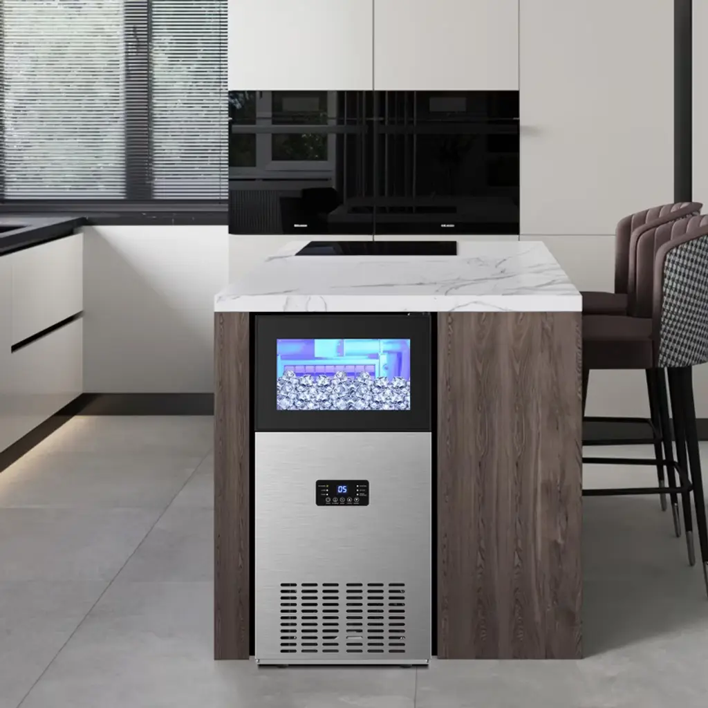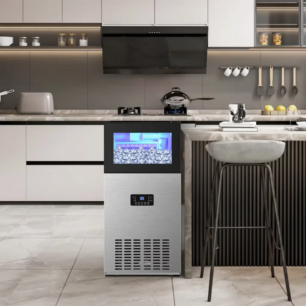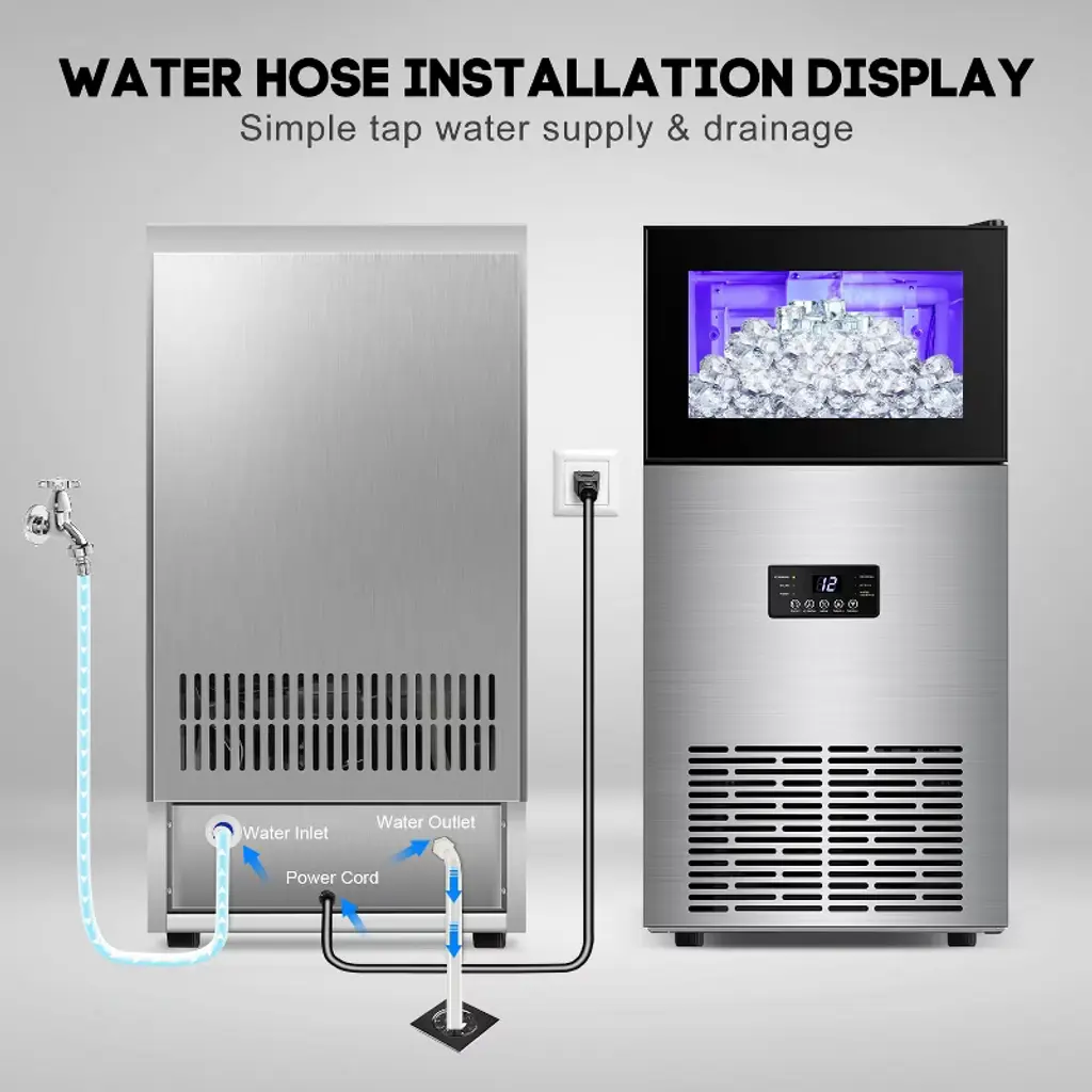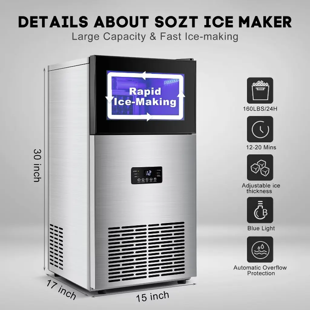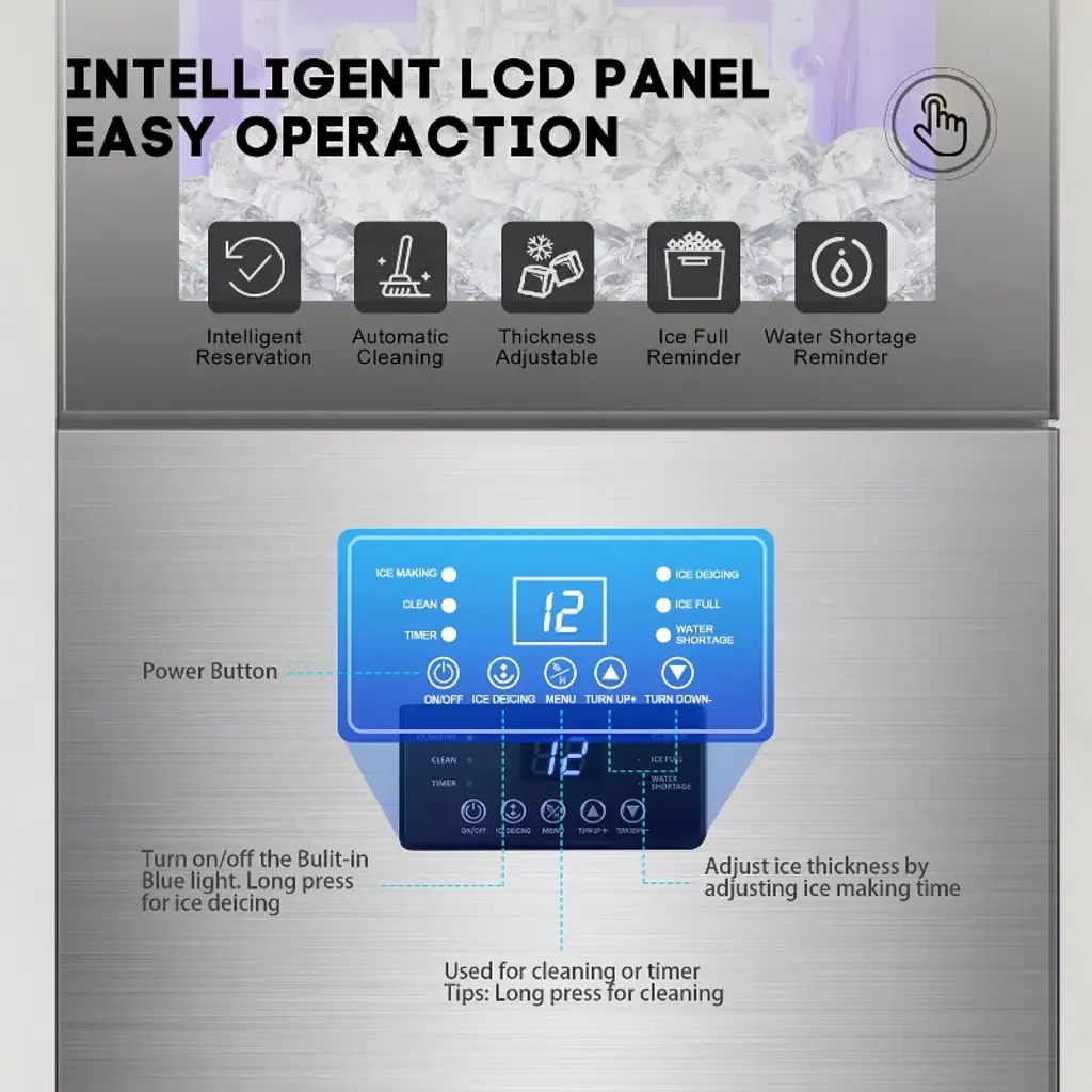 Produce 160 lbs of ice per day with the commercial ice maker, featuring a 35 lb storage capacity and the ability to make 63 clear ice cubes (0.9¡±3) per cycle in just 11¨C20 minutes. Easy to install and operate with its freestanding design, intuitive LCD panel, and transparent viewing window, it offers customizable ice thickness, self-cleaning, and smart reminders. Built with durable stainless steel, this reliable machine is ideal for restaurants, bars, homes, and more.