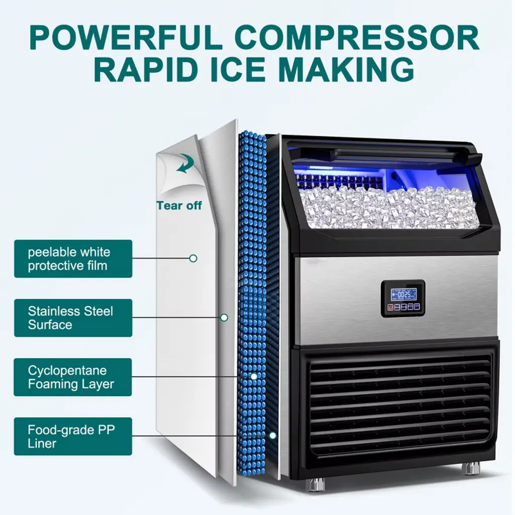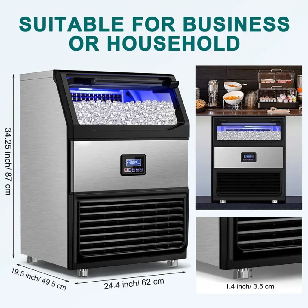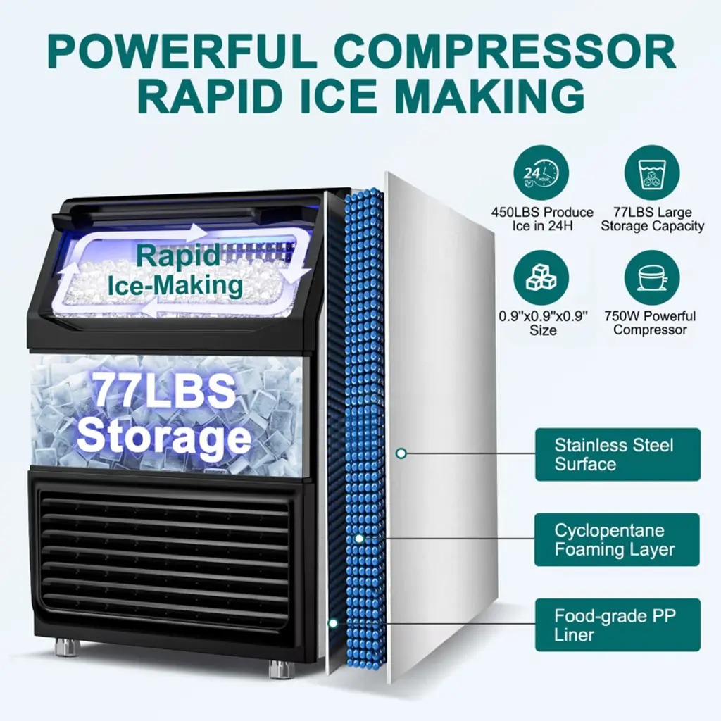 Produce up to 450 lbs of ice daily with this high-capacity commercial nugget ice maker, featuring a robust 750W compressor that completes each cycle in 11¨C15 minutes and stores 77 lbs in its rust-resistant stainless steel bin. Equipped with an intelligent LCD panel for adjustable settings and self-cleaning, it ensures energy-efficient operation and extended ice retention. Includes a water filter, drainage pipe, and ice scoop¡ªperfect for high-demand settings like bars, restaurants, and hotels.