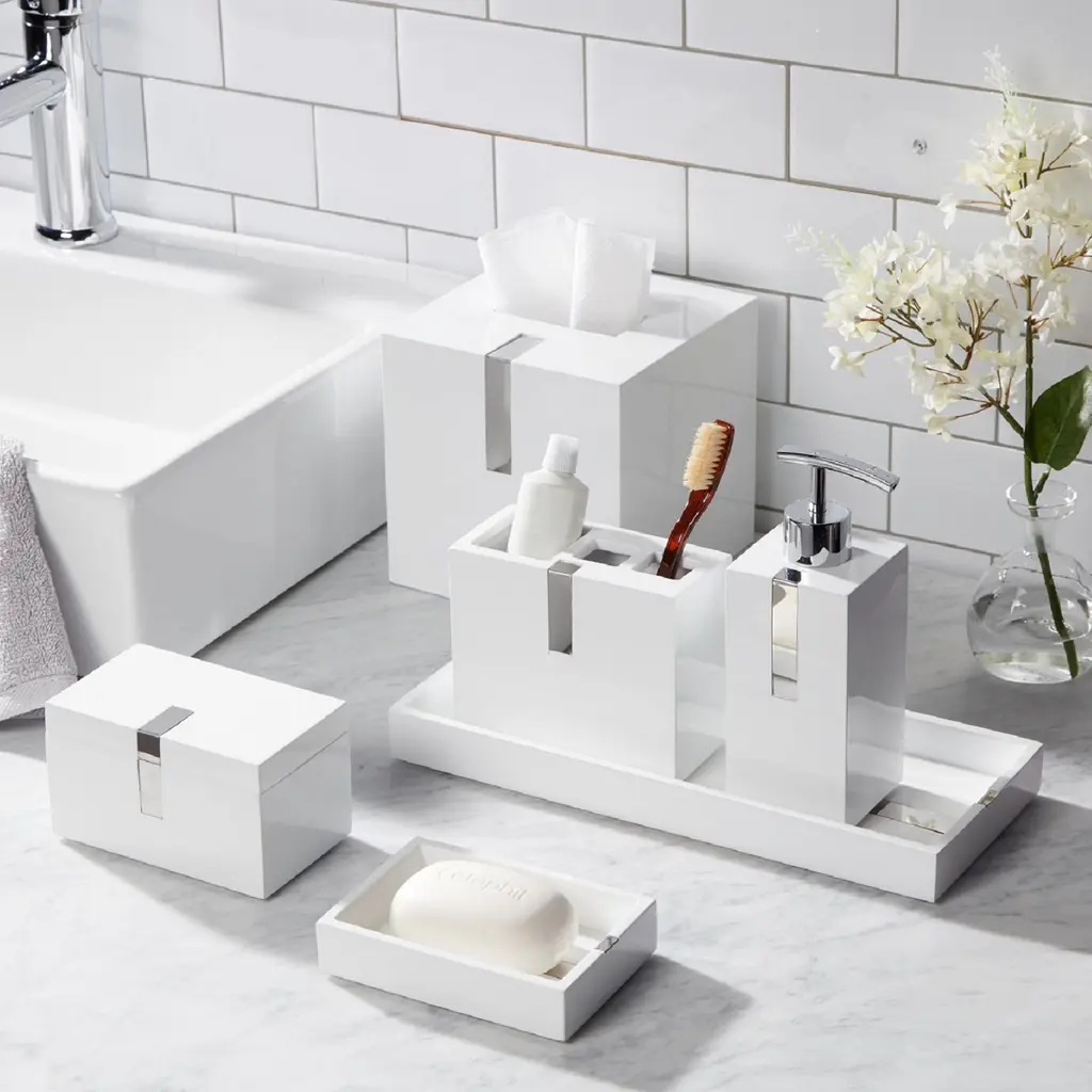 The Houston Street bath collection by Roselli features a built to last, heavy-weight solid resin finished with anti-UV and an anti-chip agent. The set includes silicone padded feet for stability.