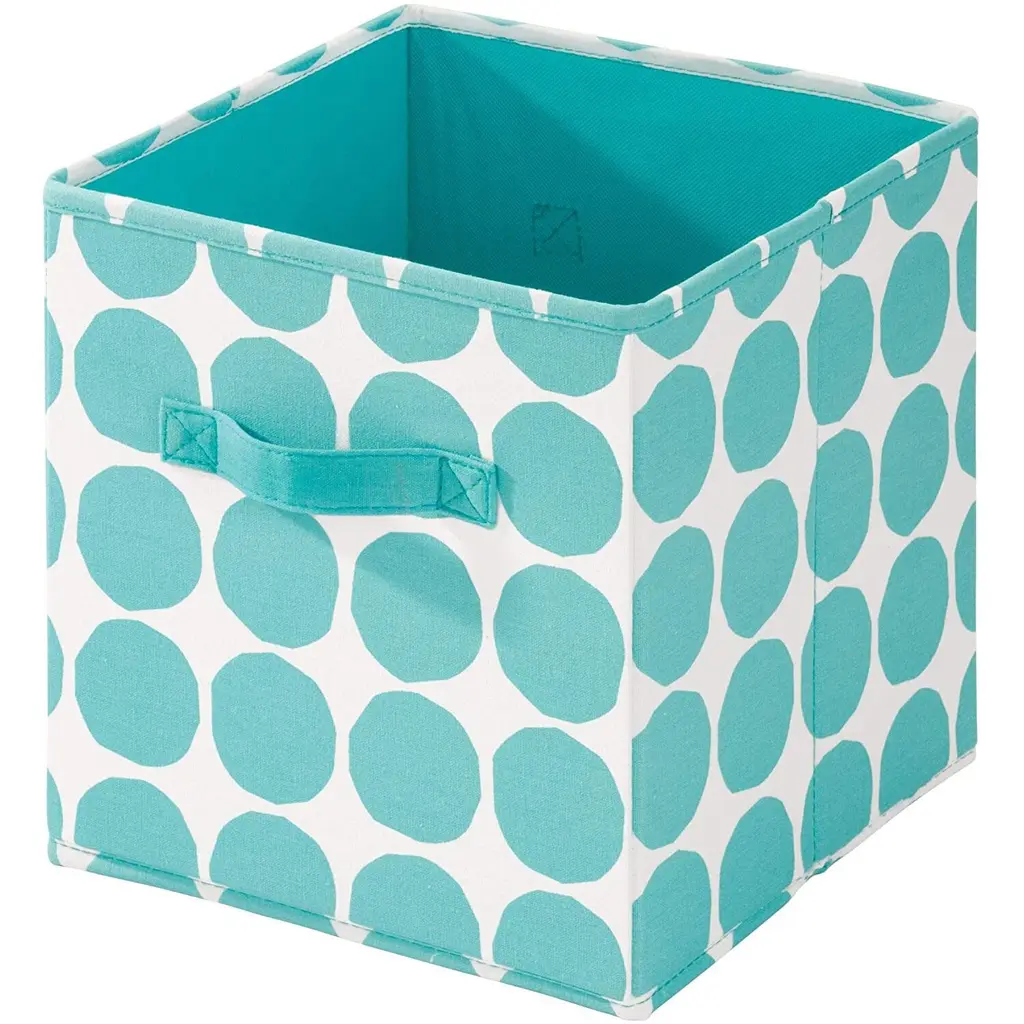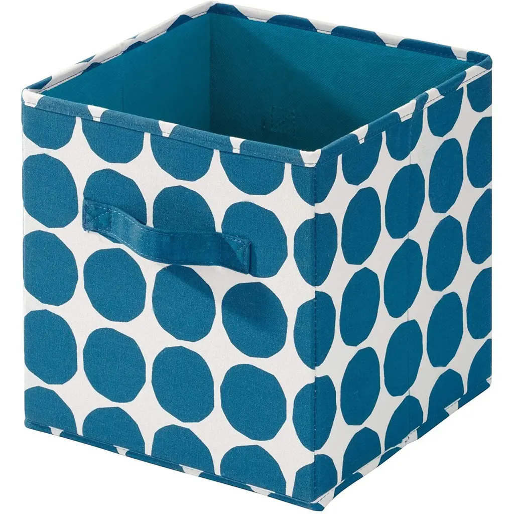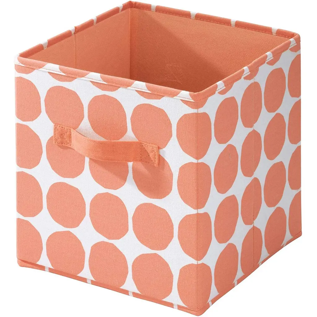 Organize your items in style with the iDesign Dot Fabric Storage Cube Bin with Dual Side Handles! This durable cube is perfect for storing clothes, winter accessories, toys, books, and more. The 2 side handles make it simple to slide the cube off of the shelf and access your items or transport the cube from room to room. The fun dot pattern adds style and whimsy to any space. Fold the cube flat when not in use to store. The storage cube fits perfectly into cube shelves and regular shelves. SIZE: 10.5x10.5x11 Inches.