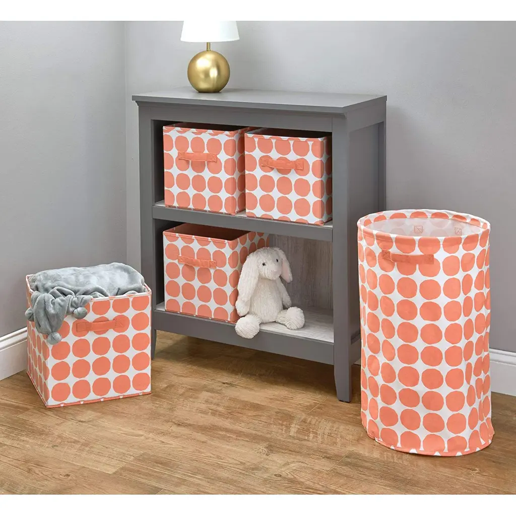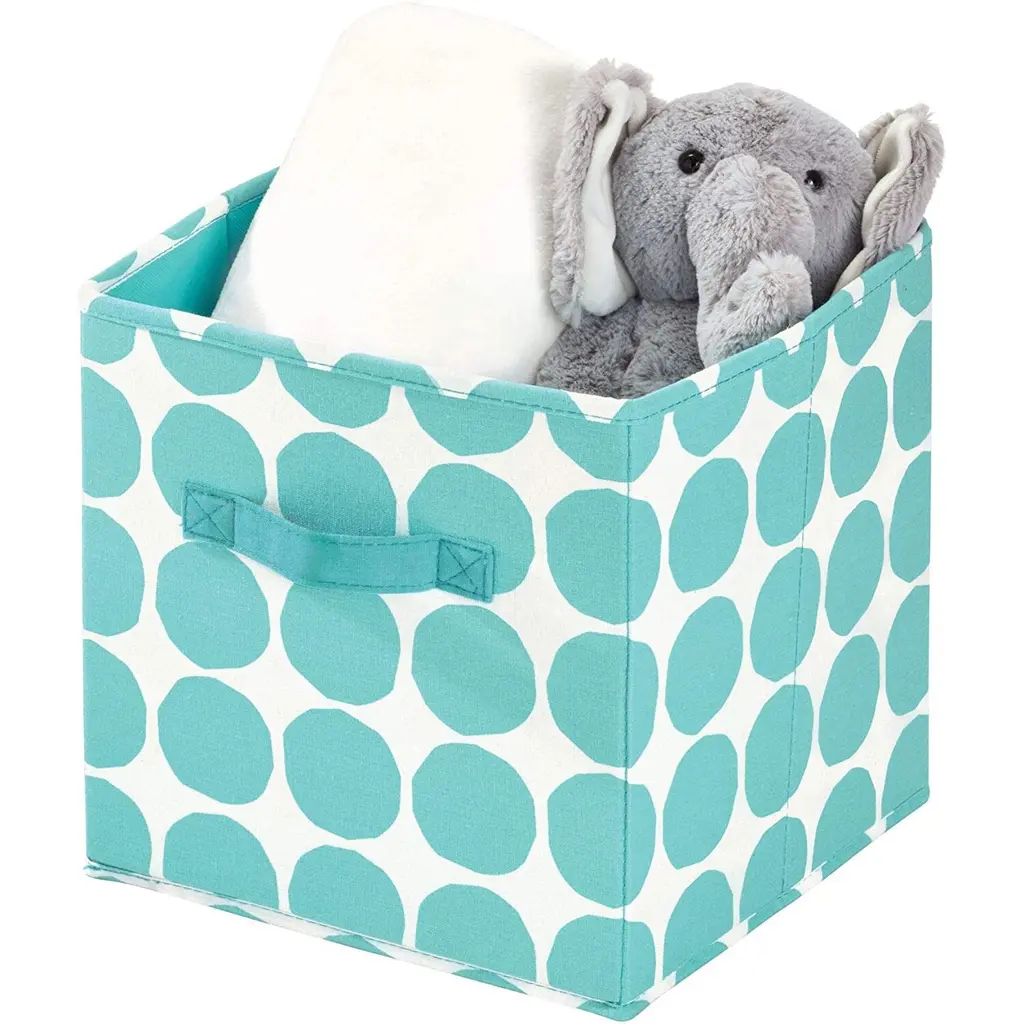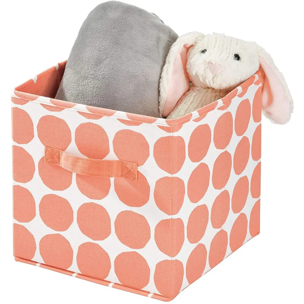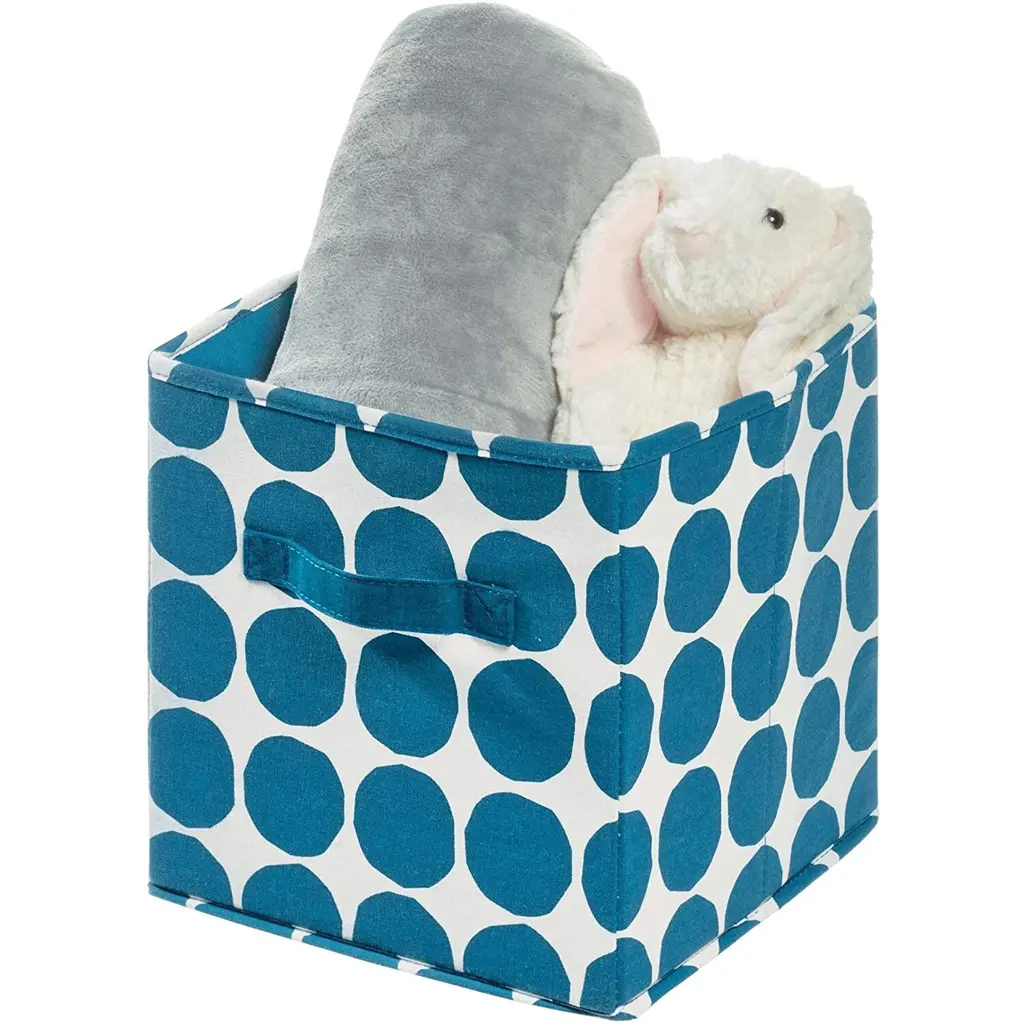 Organize your items in style with the iDesign Dot Fabric Storage Cube Bin with Dual Side Handles! This durable cube is perfect for storing clothes, winter accessories, toys, books, and more. The 2 side handles make it simple to slide the cube off of the shelf and access your items or transport the cube from room to room. The fun dot pattern adds style and whimsy to any space. Fold the cube flat when not in use to store. The storage cube fits perfectly into cube shelves and regular shelves. SIZE: 10.5x10.5x11 Inches.