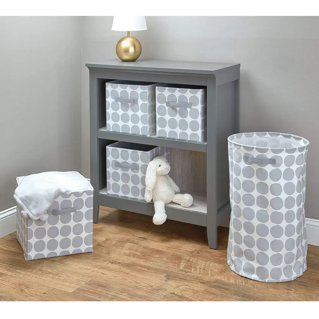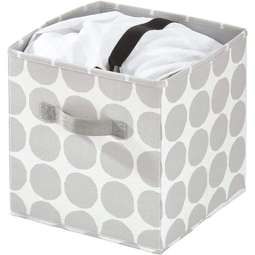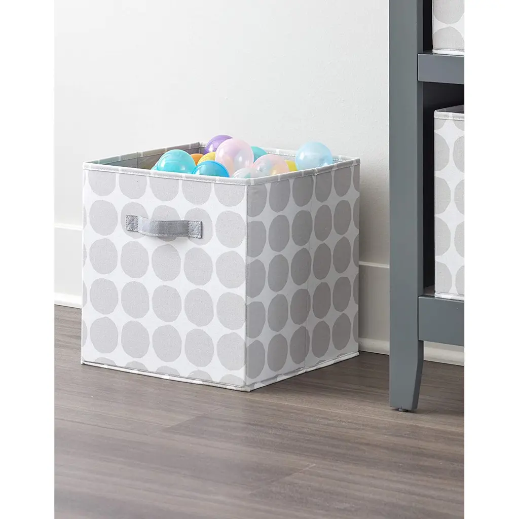 Organize your items in style with the iDesign Dot Fabric Storage Cube Bin with Dual Side Handles! This durable cube is perfect for storing clothes, winter accessories, toys, books, and more. The 2 side handles make it simple to slide the cube off of the shelf and access your items or transport the cube from room to room. The fun dot pattern adds style and whimsy to any space. Fold the cube flat when not in use to store. The storage cube fits perfectly into cube shelves and regular shelves. SIZE: 13x13x13 Inches.