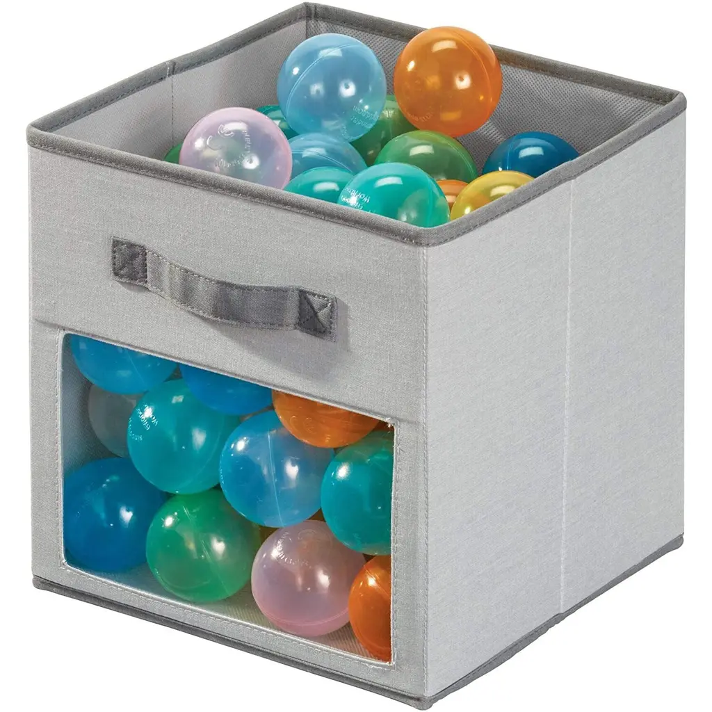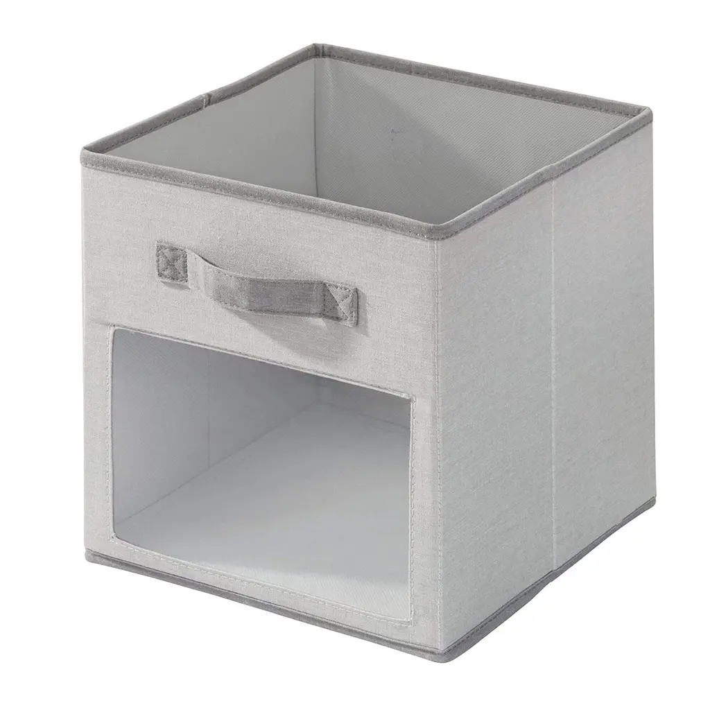 The iDesign Fabric Storage Cube Bin With Clear Window in Gray is the perfect solution for all your storage needs. This cube bin offers ample space to keep your clothes and household items organized and easily accessible. The innovative transparent window design allows you to see the contents of the bin at a glance, making it quick and effortless to find what you're looking for. No more rummaging through cluttered bins! The open top design makes it convenient to store clothes, magazines, toys, folded blankets, and more. The reinforced handles on the front of the bin ensure easy transportation, while its compact size allows it to fit perfectly in cube units and storage cubbies. Say goodbye to clutter and hello to stylish and functional storage with these chic clear storage cubes!Features: