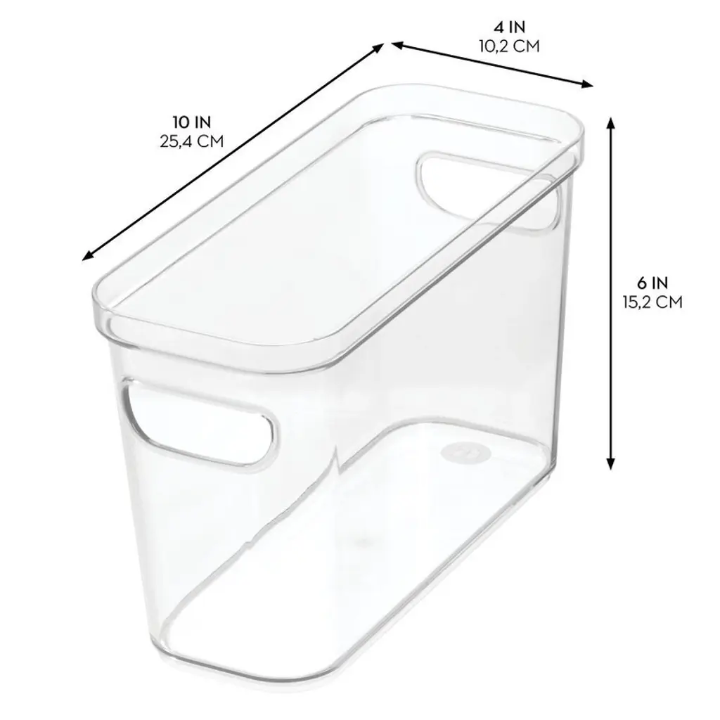 Stop stressing and start streamlining your kitchen with the versatile iDesign Crisp Pantry Bins. These no-fail organizer bins are ideal for corralling tall bottles, snacks, boxed foods, and any other items you want to avoid losing to the back of the pantry. For efficiency, use these bins in multiples or combine it with other Crisp organizers, allowing you to sort and arrange items by size or use. The crystal-clear construction lets you keep quick inventory without rummaging, instantly reducing shelf clutter. Thoughtfully selected details include rounded corners and sleek, integrated handles that make it easy to slide the bin in and out of the fridge for easy access. Even when space is tight, this organizer bin tucks into the slimmest of shelf spaces, creating additional storage inside your refrigerator, pantry, or kitchen cabinet. With iDesign, you can live simply every day.