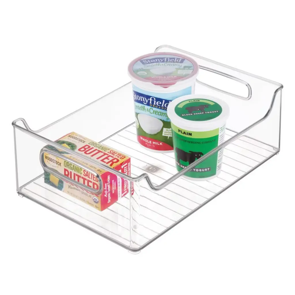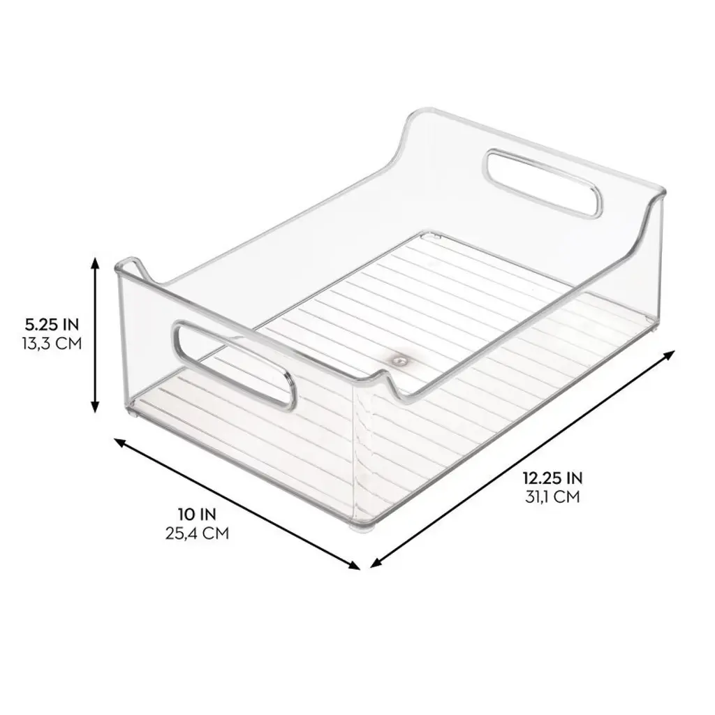 The iDesign Pantry Bin is a versatile solution that corrals snacks, boxed foods, and other food items you want to avoid losing to the back of the pantry. Its spacious, open-top layout grants immediate reach-in access to food items, and the notched design allows for proper air circulation when stacked, creating ideal storage for fruits and vegetables. Its transparent construction offers unobstructed views for instant visibility, and two comfortable carry handles facilitate easy transport.