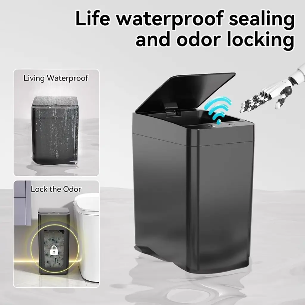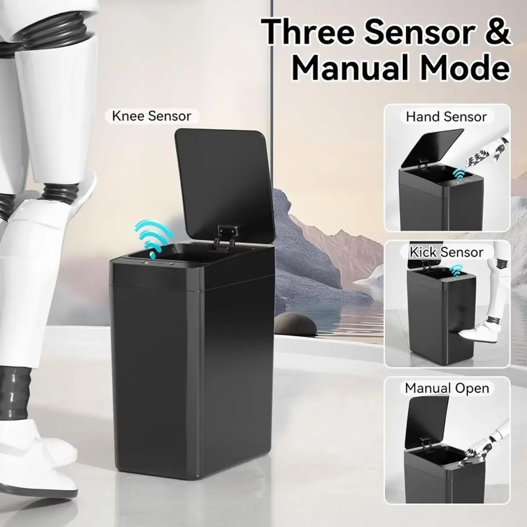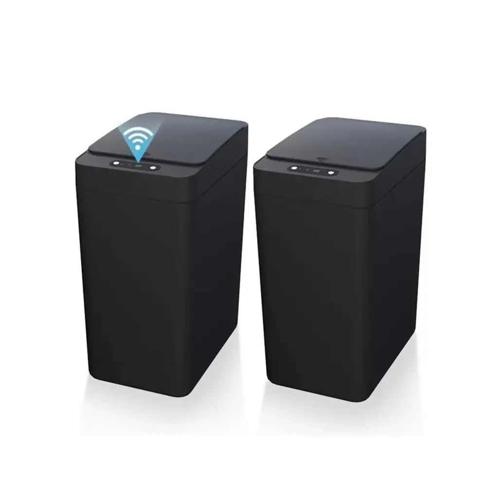 This 2-pack 2.6-gallon touchless automatic trash can (9.3"L x 6.3"W x 12.6"H) uses advanced infrared sensing—wave your hand, knee, or foot to open the lid, plus a manual mode to keep it open/closed, perfect for cooking or busy tasks. Made of high-quality waterproof ABS+PP, it works great in wet spaces like bathrooms and fits tight spots (bedrooms, RVs, offices) with its slim rectangular design. It’s airtight to lock in odors, easy to clean with a rag, and has a trash bag fixing ring to keep bags secure and hidden, blending practicality with neatness.
