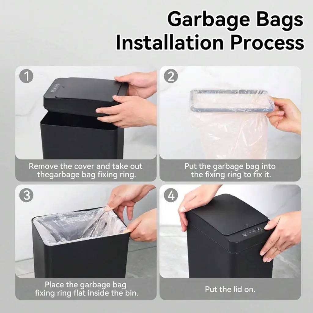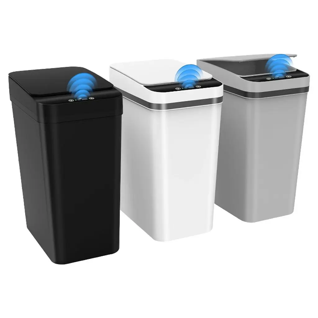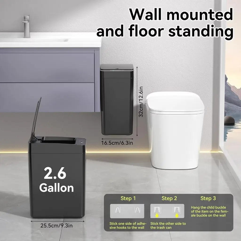 This 2-pack 2.6-gallon touchless automatic trash can (9.3"L x 6.3"W x 12.6"H) uses advanced infrared sensing—wave your hand, knee, or foot to open the lid, plus a manual mode to keep it open/closed, perfect for cooking or busy tasks. Made of high-quality waterproof ABS+PP, it works great in wet spaces like bathrooms and fits tight spots (bedrooms, RVs, offices) with its slim rectangular design. It’s airtight to lock in odors, easy to clean with a rag, and has a trash bag fixing ring to keep bags secure and hidden, blending practicality with neatness.
