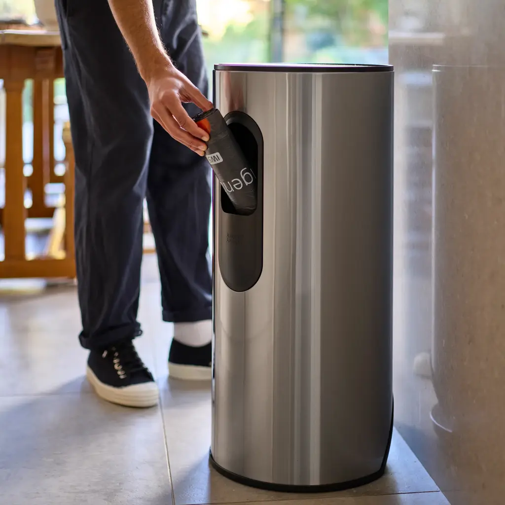 A stylish, circular bin with an easy-push petal. From Joseph Joseph comes this sleek stainless steel Arc Trash Bin, designed with space-saving in mind. The soft-close lid opens when you step on the easy-push petal, which is ingeniously integrated into the Arc’s footprint, saving valuable floor space. The bin also features a discreet cubby in the back for replacement liner bags, always where you need them and freeing space up elsewhere in your kitchen. Features of the Joseph Joseph Arc Trash Bin include: Stylish round design. Soft-close lid with a fingerprint-proof coating. Large, easy-push foot petal that fits neatly within the footprint of the bin. Easy-empty removable trash bucket. Storage cubby for replacement liners. Small: 17.6h x 10.2w x 10.5”d., 2.6 gallons. Large: 28.2h x 13.2w x 13.4”d, 7.9 gallons.