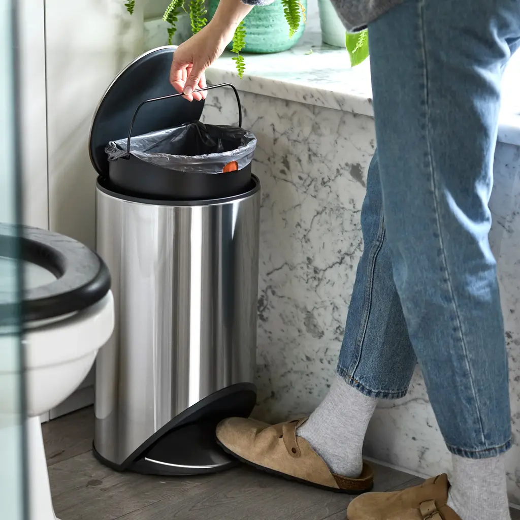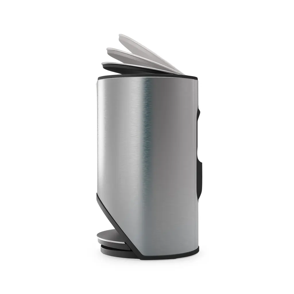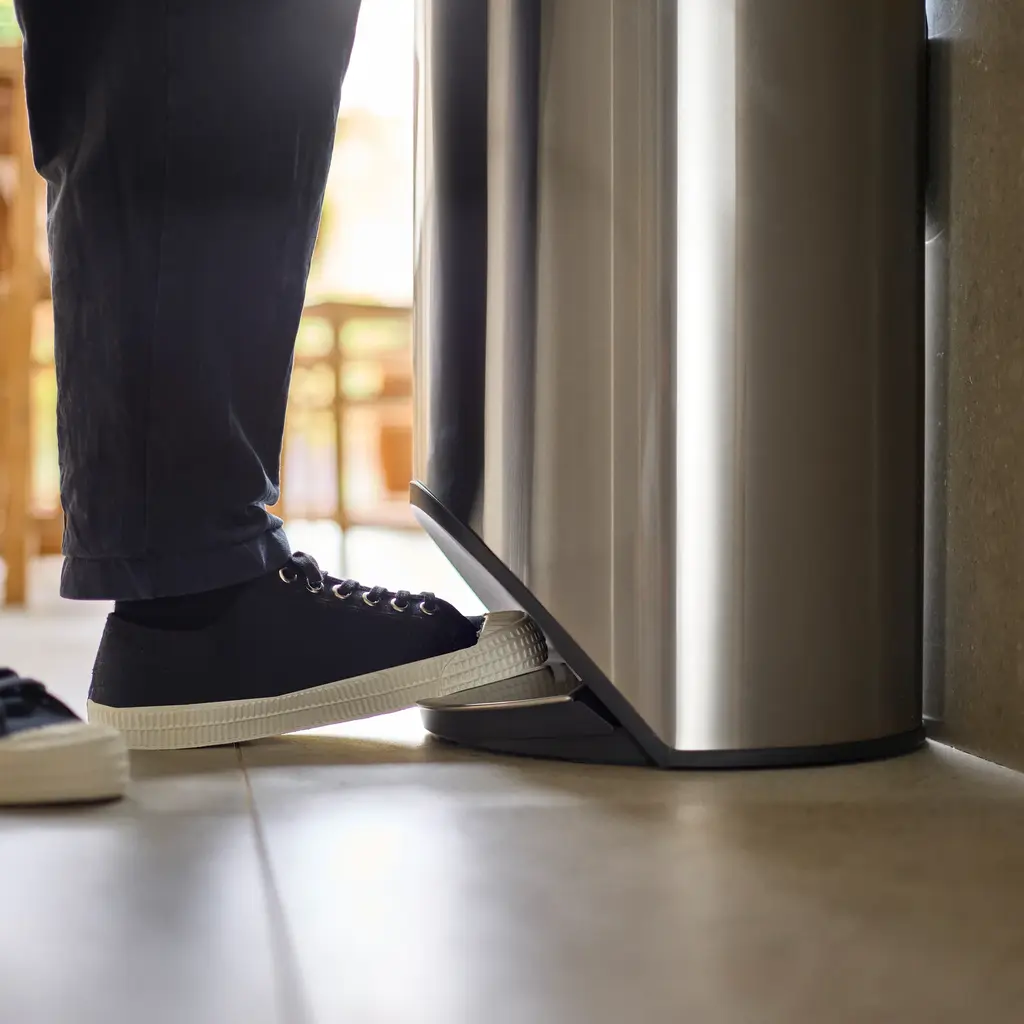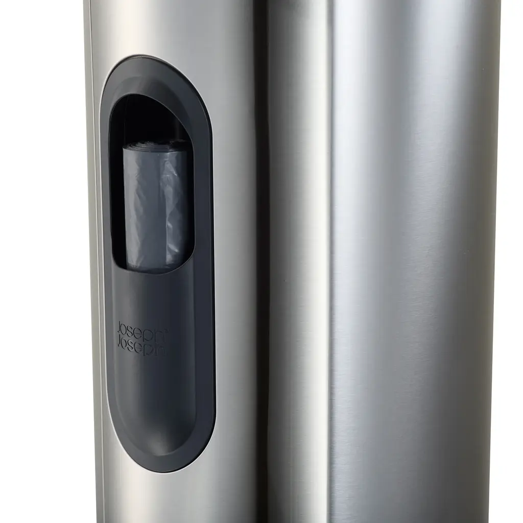 A stylish, circular bin with an easy-push petal. From Joseph Joseph comes this sleek stainless steel Arc Trash Bin, designed with space-saving in mind. The soft-close lid opens when you step on the easy-push petal, which is ingeniously integrated into the Arc’s footprint, saving valuable floor space. The bin also features a discreet cubby in the back for replacement liner bags, always where you need them and freeing space up elsewhere in your kitchen. Features of the Joseph Joseph Arc Trash Bin include: Stylish round design. Soft-close lid with a fingerprint-proof coating. Large, easy-push foot petal that fits neatly within the footprint of the bin. Easy-empty removable trash bucket. Storage cubby for replacement liners. Small: 17.6h x 10.2w x 10.5”d., 2.6 gallons. Large: 28.2h x 13.2w x 13.4”d, 7.9 gallons.