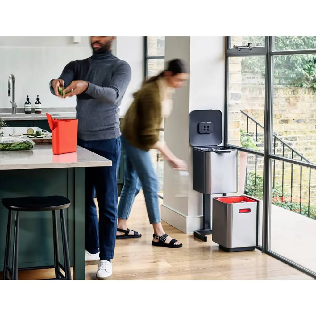 Totem is an award-winning design that combines all your waste and recycling in one compact unit. It features two compartments arranged vertically, which saves space and makes them very easy to fill and empty. Each compartment has a removable bucket that can be fitted with a single standard liner for general waste or two smaller bags, using the integrated bag hooks, for separating different types of recycling. Breather vents in the bucket sides make removing a full liner easier. Totem also features a ventilated odor filter in the main lid that helps reduce moisture and odor build up from waste. The design comes with a 3-litre (0.8 US Gallon) removable food waste caddy that can be stored in either compartment, or on the worktop. Stylish, practical and durable, Totem is available in two sizes – Totem Max (60 litres/15.8 US Gallons) and Totem Compact (40 litres/10.5 US Gallons). Custom-fit liners for the main compartments and compostable liners for the food waste caddy are available separately, as are replaceable odor filters. Stainless-steel versions feature a fingerprint-proof coating, whilst other models feature an easy-clean powder-coated steel finish. Choose the right custom-fit liner: IW2 and IW7.