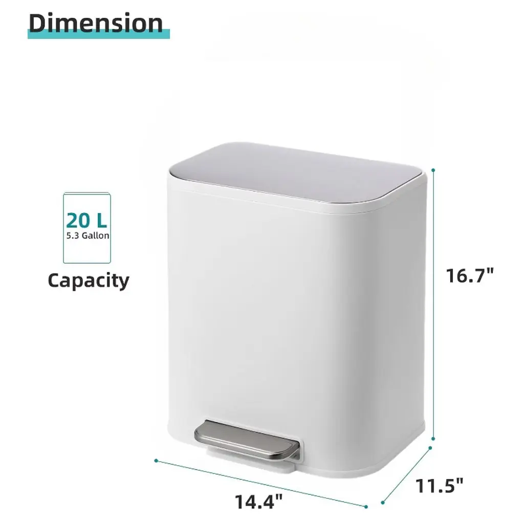 Kitchen Trash Can, 5.3 Gallon Stainless Steel Garbage Can, Step On Trash Can With Quiet Close Lid & Inner Bucket For Kitchen Office (20 Liter), White