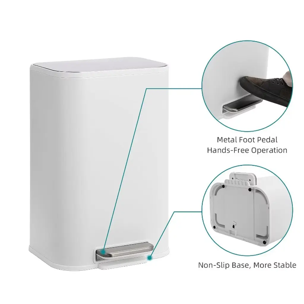 Generous Capacity: Avoid the hassle of frequent emptying with our large capacity trash can, catering effortlessly to daily household waste disposal needs, ensuring a tidy kitchen environment. Smooth, Silent Closure: Enjoy the exclusive soft-close technology that guarantees a gentle, noise-free lid closure, preventing any icky clangs and enhancing your overall user experience. Premium Stainless Steel Construction: Crafted from high-quality stainless steel, our trash can is rust-resistant, fingerprint-proof, and easy to clean, adding a sleek, stylish touch to your kitchen decor. Convenient Foot Pedal Opening: Stay hands-free and hygienic with the practical foot pedal design that allows for easy access without manual contact, perfect for busy kitchens. Removable Inner Bucket: Effortlessly maintain cleanliness with the detachable inner bucket for easy cleaning and bag replacement, effectively preventing leaks and ensuring a pristine interior. Opt for our trash can - the epitome of kitchen convenience!