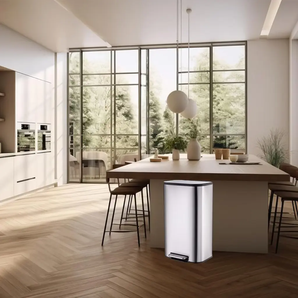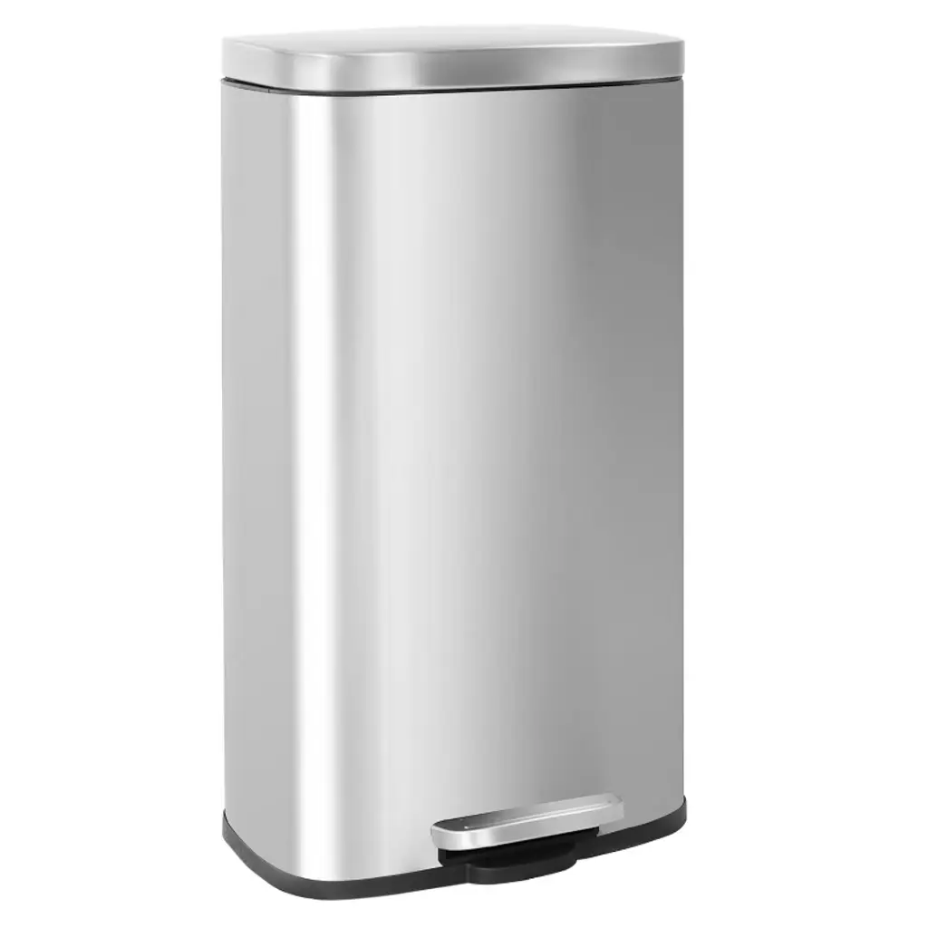 Smudge Resistant Rectangular Trash Can, Brushed Stainless Steel Step Trash Can Upgrade your waste disposal with our stainless steel kitchen trash can, featuring a silent soft-close lid, hands-free operation, and sleek design that resists rust and fingerprints! Highlights at a Glance:--Silent soft-close lid for quiet disposal--Hands-free step trash can with lid for easy use--Sleek stainless steel design resists rust and fingerprints--Generous 7.9/5.3/3.2-gallon capacity perfect for kitchen waste bin--Versatile trash can cabinet for stylish organization Specification:Size: 7.9 gallon (30L): 14.4"L x 11.5"W x 24"H5.3 gallon (20L): 14.4"L x 11.5"W x 16.7"H3.2 gallon (12L): 11.2"L x 9.1"W x 16.6"HUse for: Indoor,Outdoor,Kitchen,Commercial,Home,OfficeMaterial: Stainless Steel Packing List:1 x Stainless Steel Trash Can Friendly Note:1. Avoid Abrasive Materials: Use non-abrasive cleaning tools to avoid scratching the surface of the waste bin. Avoid steel wool or harsh chemicals that may damage the finish.2. Proper Waste Disposal: Always use trash bags that fit your trash bin size to prevent spills and make cleanup easier. Make sure to tie bags securely before removing them to avoid messes.3. Keep Away from Heat Sources: Position your trash can away from direct heat sources, such as ovens or stovetops. High temperatures may affect the materials and the integrity of the can.