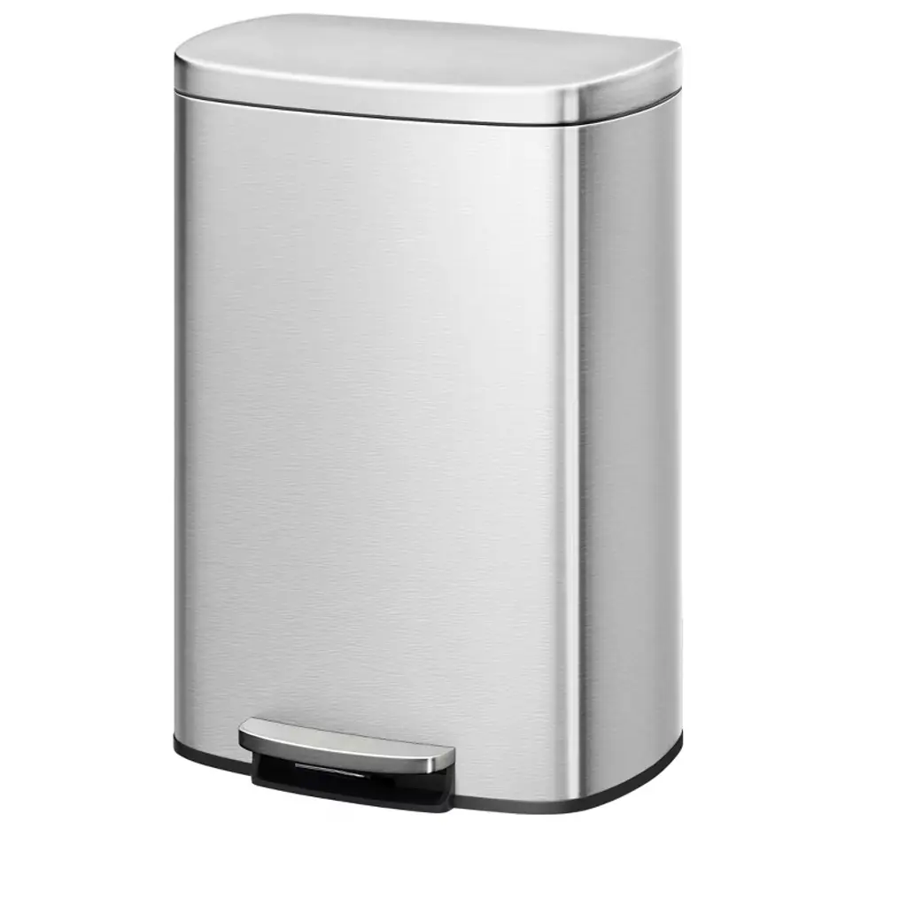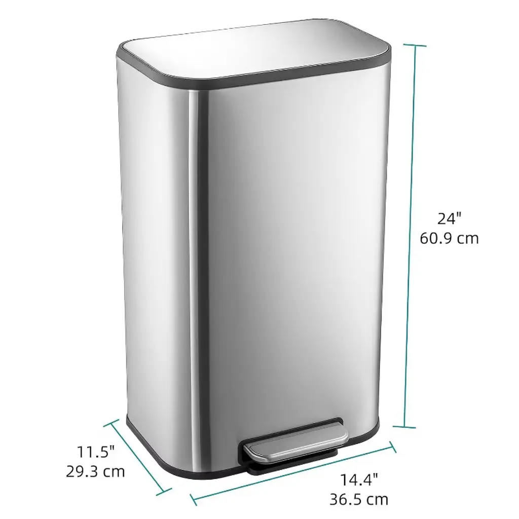Generous Capacity: Avoid the hassle of frequent emptying with our large capacity trash can, catering effortlessly to daily household waste disposal needs, ensuring a tidy kitchen environment. Smooth, Silent Closure: Enjoy the exclusive soft-close technology that guarantees a gentle, noise-free lid closure, preventing any icky clangs and enhancing your overall user experience. Premium Stainless Steel Construction: Crafted from high-quality stainless steel, our trash can is rust-resistant, fingerprint-proof, and easy to clean, adding a sleek, stylish touch to your kitchen decor. Convenient Foot Pedal Opening: Stay hands-free and hygienic with the practical foot pedal design that allows for easy access without manual contact, perfect for busy kitchens. Removable Inner Bucket: Effortlessly maintain cleanliness with the detachable inner bucket for easy cleaning and bag replacement, effectively preventing leaks and ensuring a pristine interior. Opt for our trash can - the epitome of kitchen convenience!