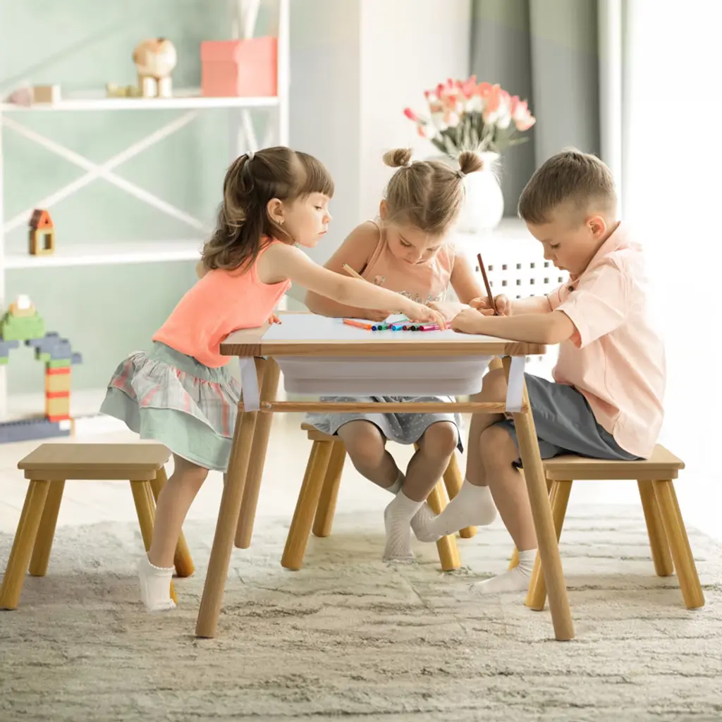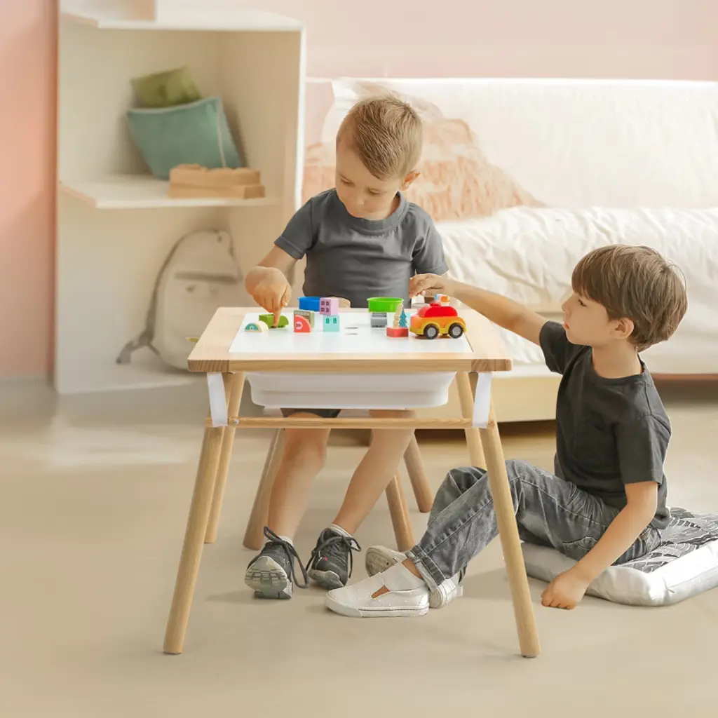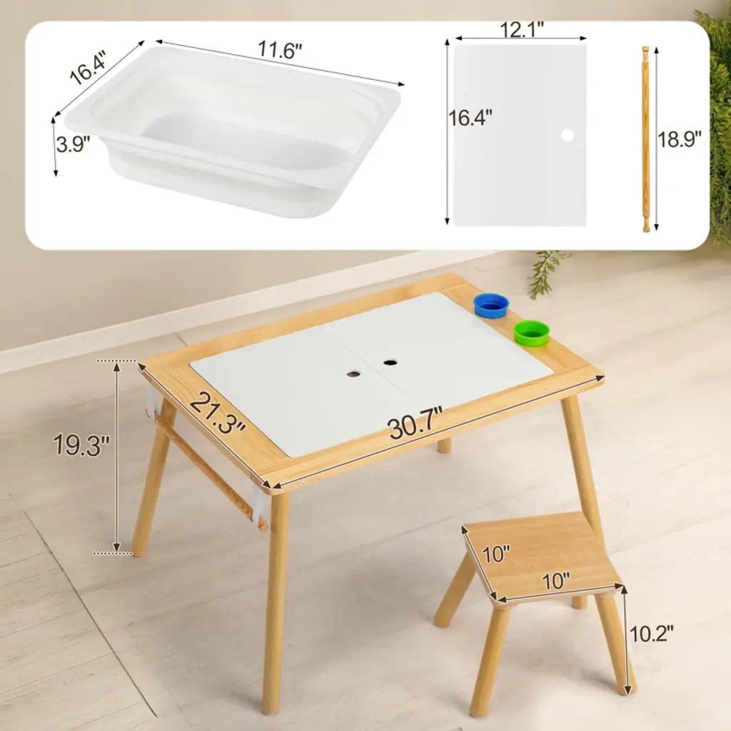 Encourage creativity and learning with this versatile Children's Sensory Table with Stool. Thoughtfully designed to cater to a wide range of activities, this multi-functional table is perfect for play, study, dining, reading, and crafting. Its robust natural solid wood construction ensures safety and durability, while its built-in storage features keep toys, art supplies, and other essentials neatly organized. Whether in a playroom, daycare, or classroom, this sensory table seamlessly combines functionality with a sleek, modern design, making it a delightful addition to any kid-friendly space.