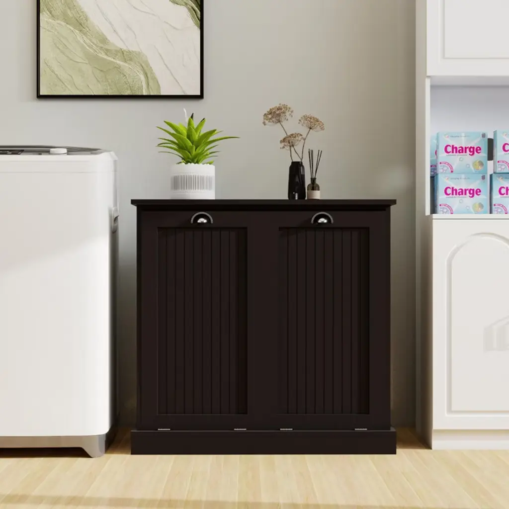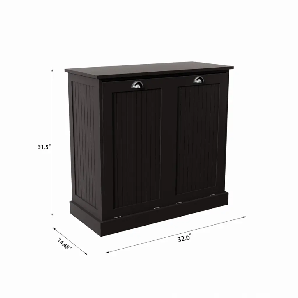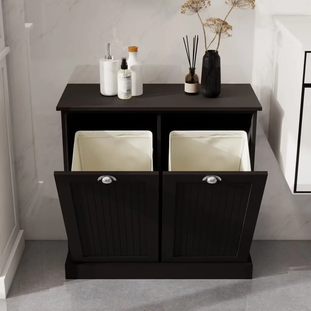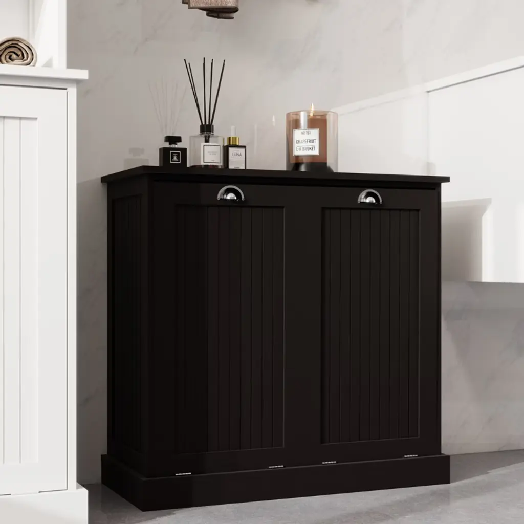 Kwpzqeb Double Tilt Out Laundry Hamper Cabinet, 20 Gallon Farmhouse Trash Can Cabinet, Hidden Wood Garbage Can With Laundry Basket For Bathroom, Black
