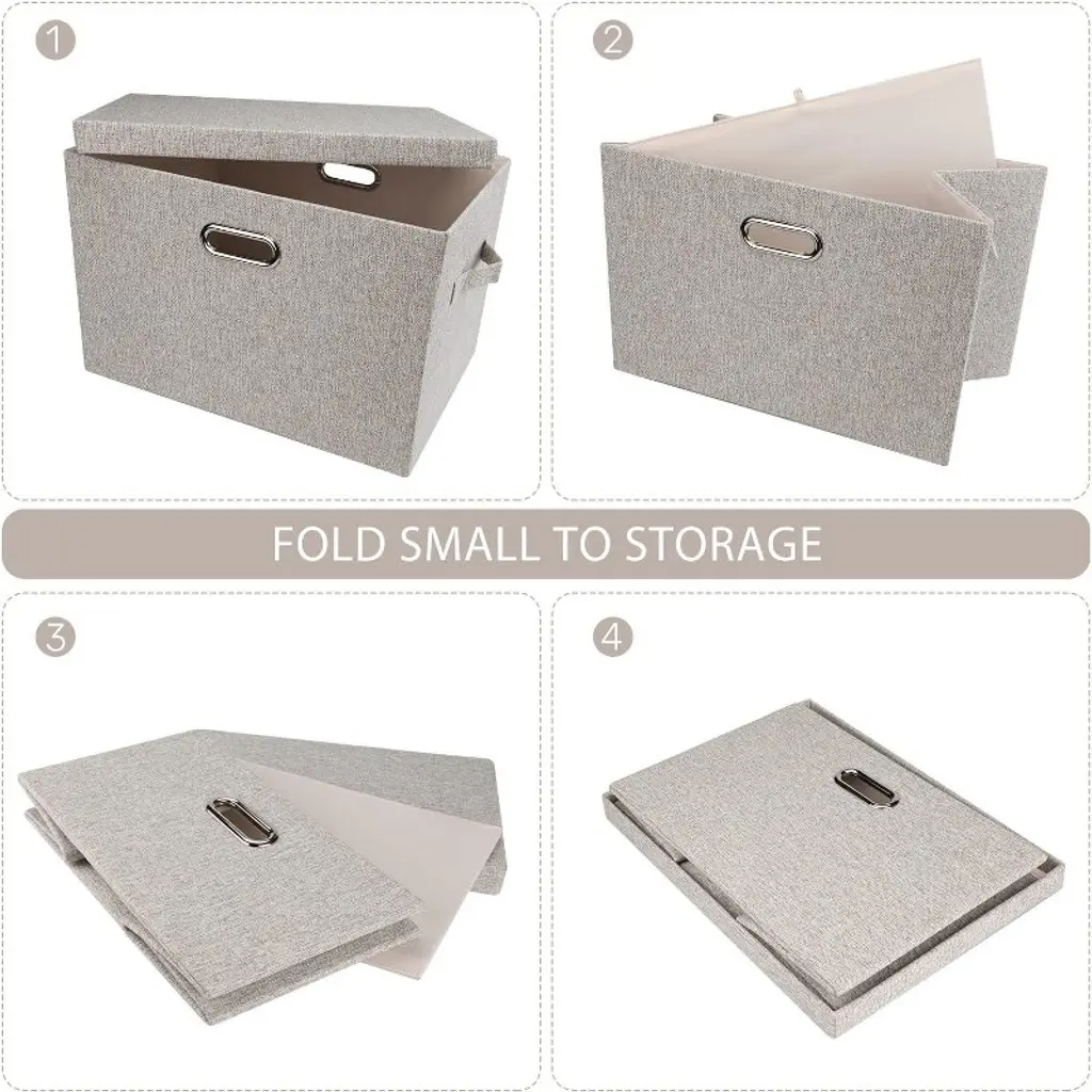 [Sturdy and Stackable] The storage bins with lids are consist of heavy-duty thick hard cardboards with a solid bottom and a removable shelf bins lid. Every large storage bin can hold things with weight at least up to 70 pounds, you can stack them upon one by one. [Constant Use] Covered by thick textured cloth, our large lidded storage bins prevent daily wears and tears. They can keep dust and bugs out also, avoiding dirt and musty smell. You can use these decorative storage boxes with lids everyday or for long term storage. [Foldable Space Saver] Our Sturdy collapsible storage bins can be folded flat into lid and easy to be assembled. They can hide and hold numbers of clutters, freeing up amount of space and making everything looks organized. When you don't use them, they are very easy to be stored or carried with. [Convient 4 Handles] Every side has 1 handle, 2 metal handles for carring things heavy, 2 cloth stripe handles for taking lightweight items. This design makes it easy to pull the storage basket from any side while keeps them from getting flimsy as they last.