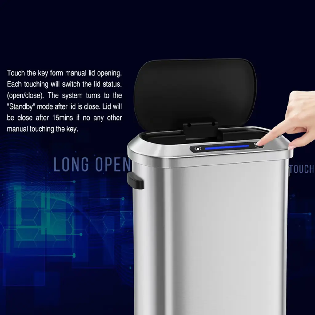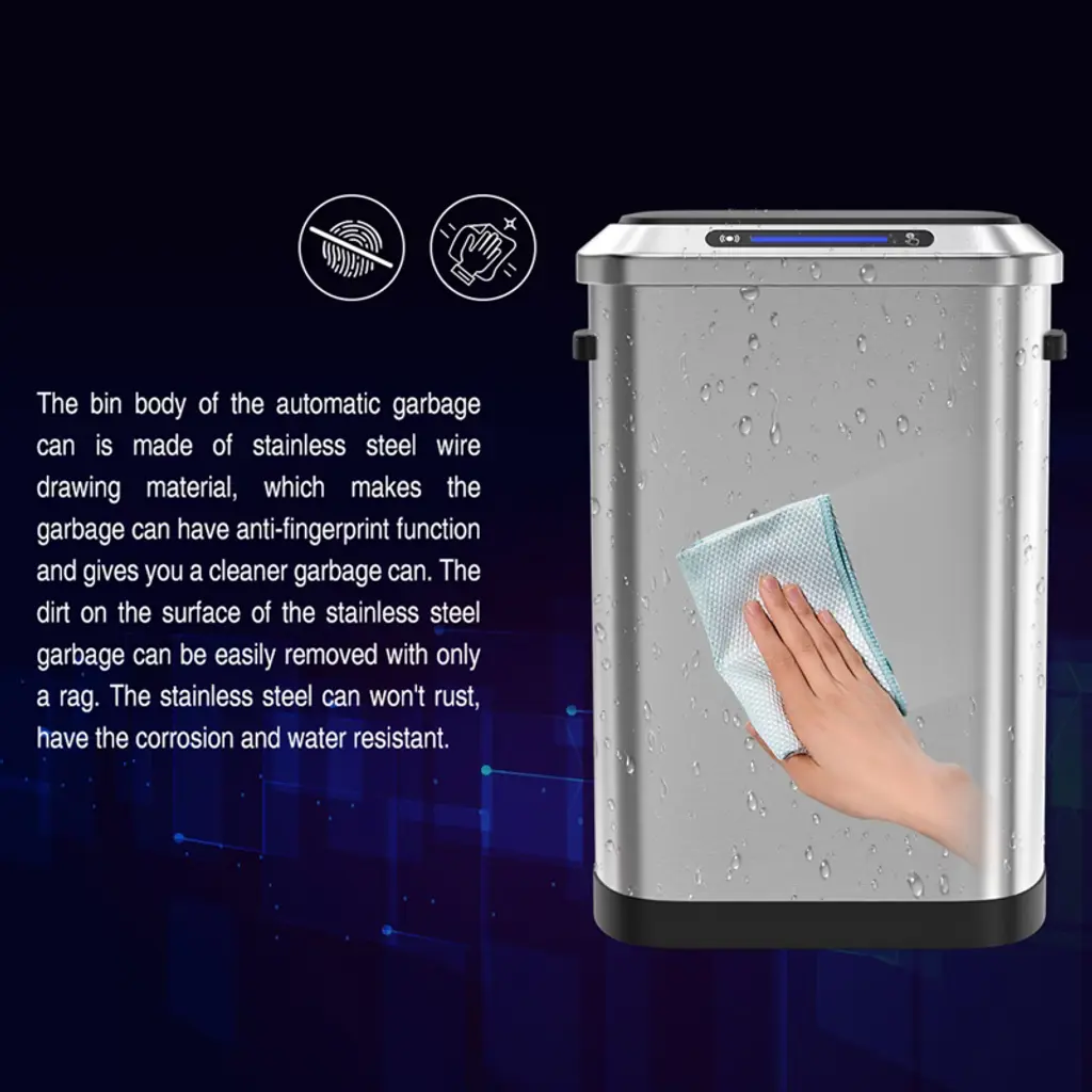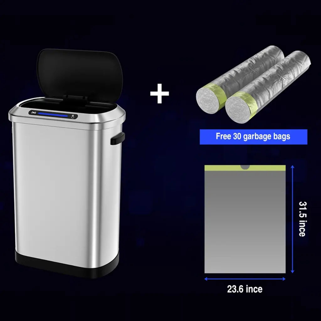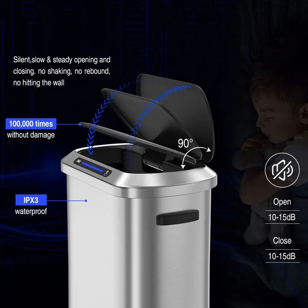 This product is a motion sensor trash can. Need to install 4 AA batteries(not included). When an object approaches the trash can, hands-free operation lid opens within moment when in range of the sensor, and the lid will automatically close after staying for 5 seconds(Closure process indicated by countdown beam). This top lid uses our independently developed slow landing technology. The lid closes with hardly any sound, if the person next to you is taking a nap, there is no need to worry about disturbing them with this bin. High quality all stainless-steel thickened trash can body by 0.45MM stainless steel material production. Compared to most 0.3MM materials trash can on the market, our stainless steel trash can are less prone to deformation and are stronger in use! 17''L×11''W×24.76''H, 13.2 gallon/50 liter. The huge capacity definitely meets your daily use. It can be a good helper for your kitchen and make your room clean and tidy. The sophisticated rectangular appearance also makes it suitable for a variety of occasions. It makes a shining impression from the outside.