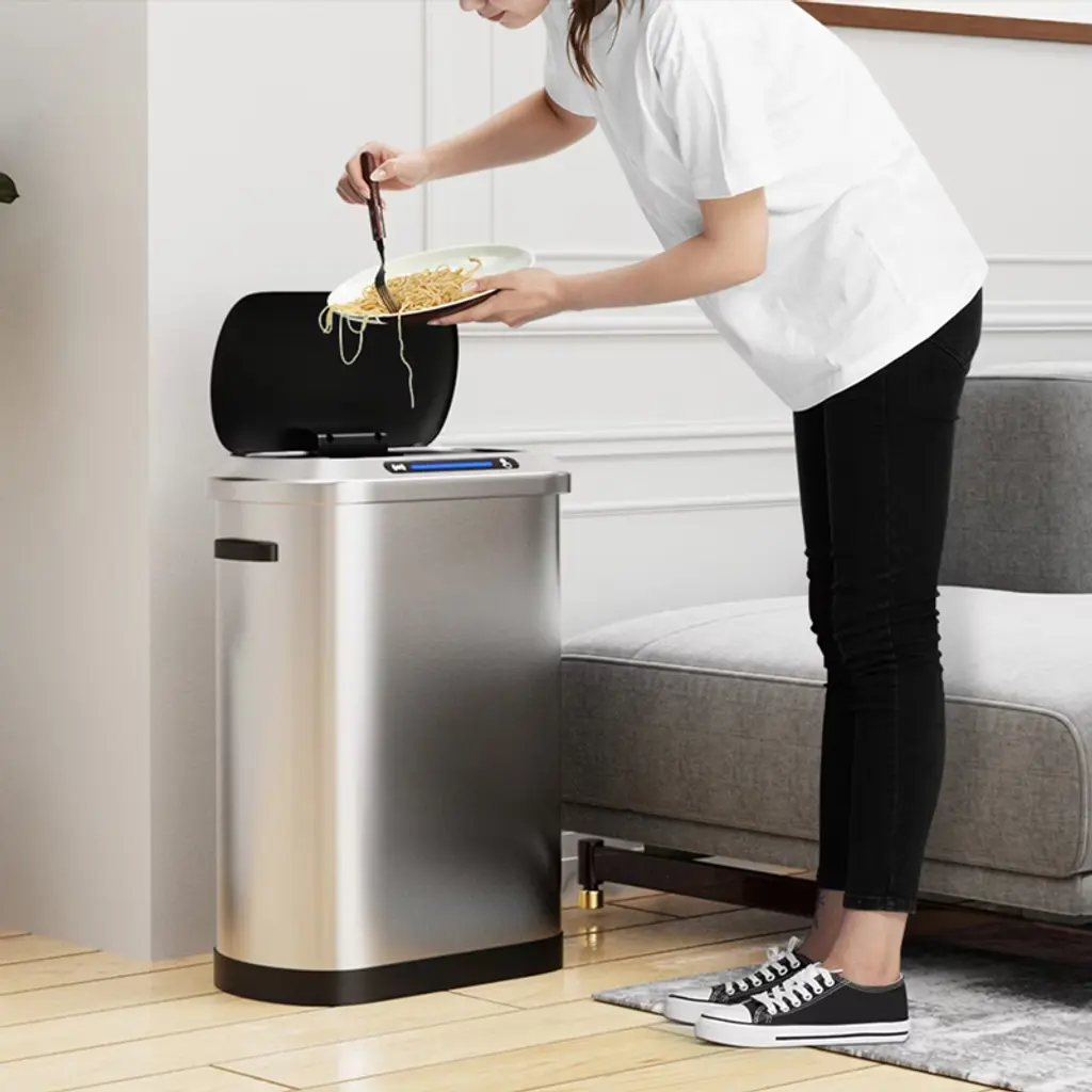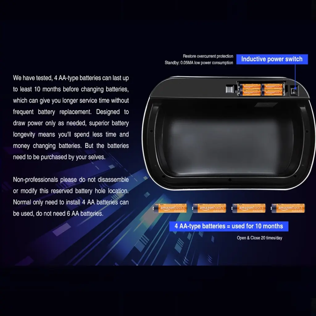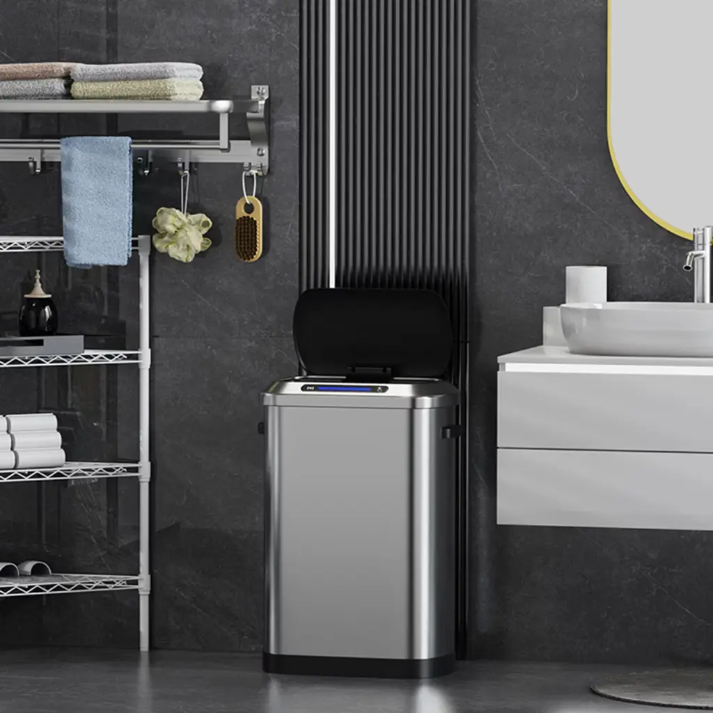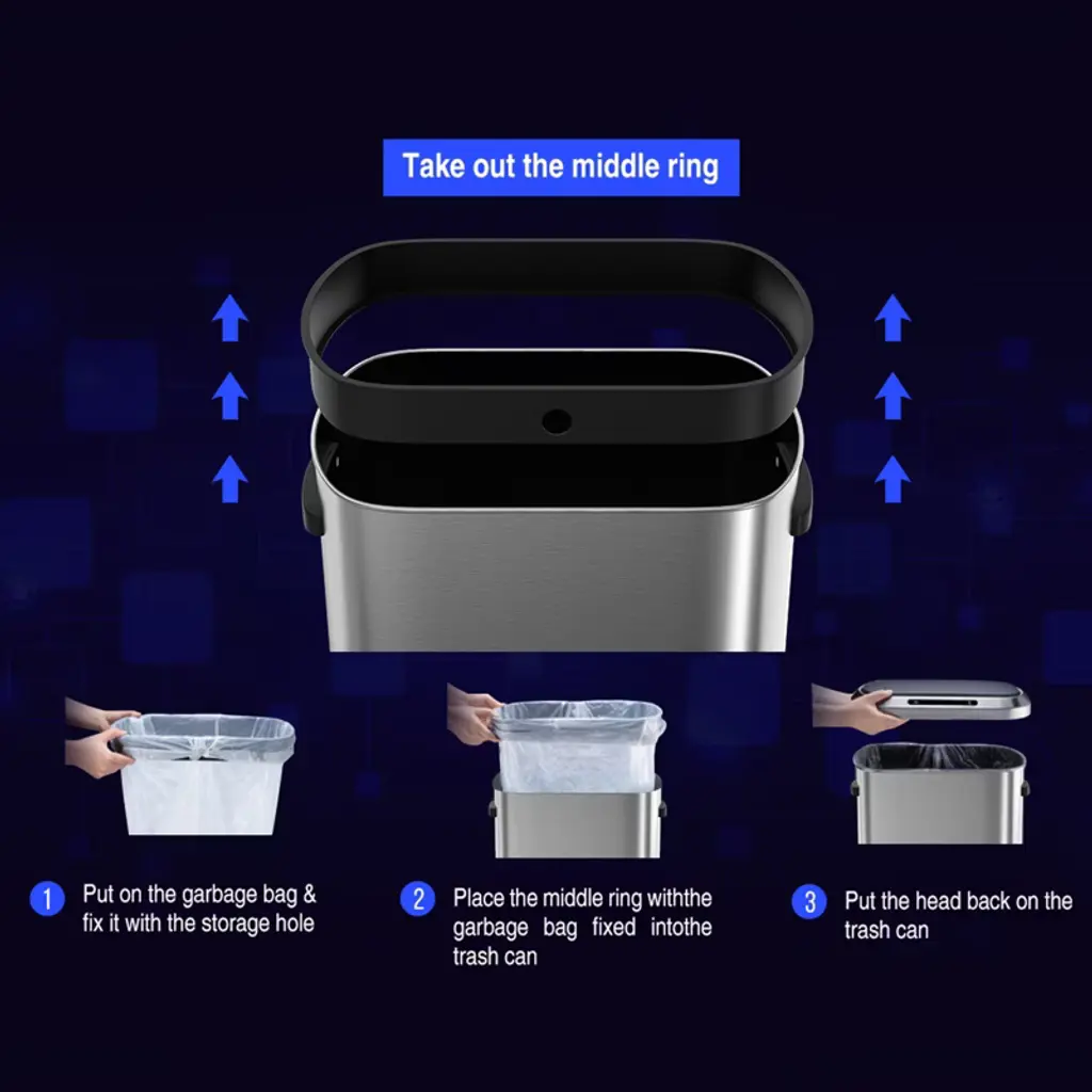 This product is a motion sensor trash can. Need to install 4 AA batteries(not included). When an object approaches the trash can, hands-free operation lid opens within moment when in range of the sensor, and the lid will automatically close after staying for 5 seconds(Closure process indicated by countdown beam). This top lid uses our independently developed slow landing technology. The lid closes with hardly any sound, if the person next to you is taking a nap, there is no need to worry about disturbing them with this bin. High quality all stainless-steel thickened trash can body by 0.45MM stainless steel material production. Compared to most 0.3MM materials trash can on the market, our stainless steel trash can are less prone to deformation and are stronger in use! 17''L×11''W×24.76''H, 13.2 gallon/50 liter. The huge capacity definitely meets your daily use. It can be a good helper for your kitchen and make your room clean and tidy. The sophisticated rectangular appearance also makes it suitable for a variety of occasions. It makes a shining impression from the outside.