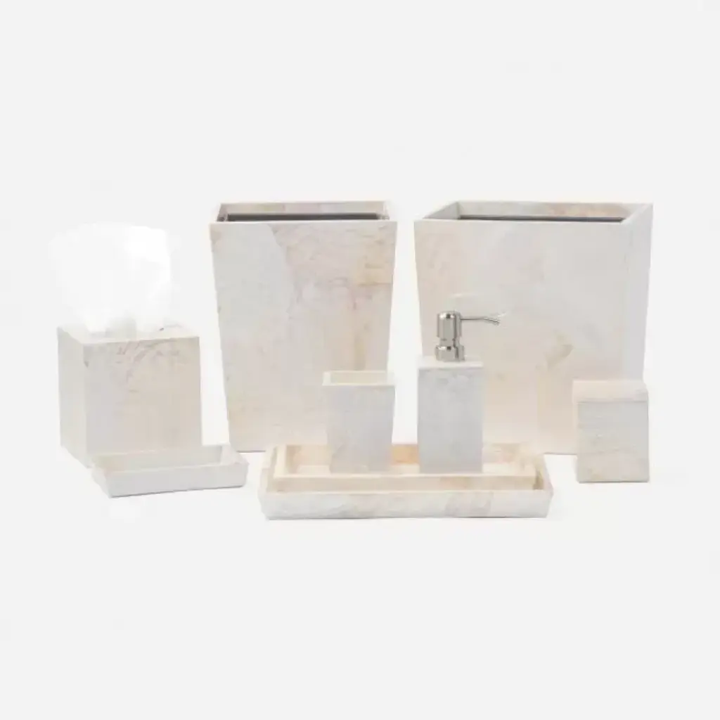 Slightly iridescent, entirely irresistible. Add a bit of refined whimsy with the pearly finish of our Lugano collection’s kabibe shell. This set provides the reflective effect of a sunlit scene in any bathroom. The designers at Pigeon & Poodle believe the details of a home are just as important as the furniture. A gorgeous toothbrush holder or handcrafted canister can elevate an entire bath, the perfect frame can heighten the feel of a whole space, and a good-looking storage basket can be your look’s missing link. With thoughtful design and top-notch craftsmanship, Pigeon & Poodle create home accessories with the care and attention typically reserved for larger pieces of décor.