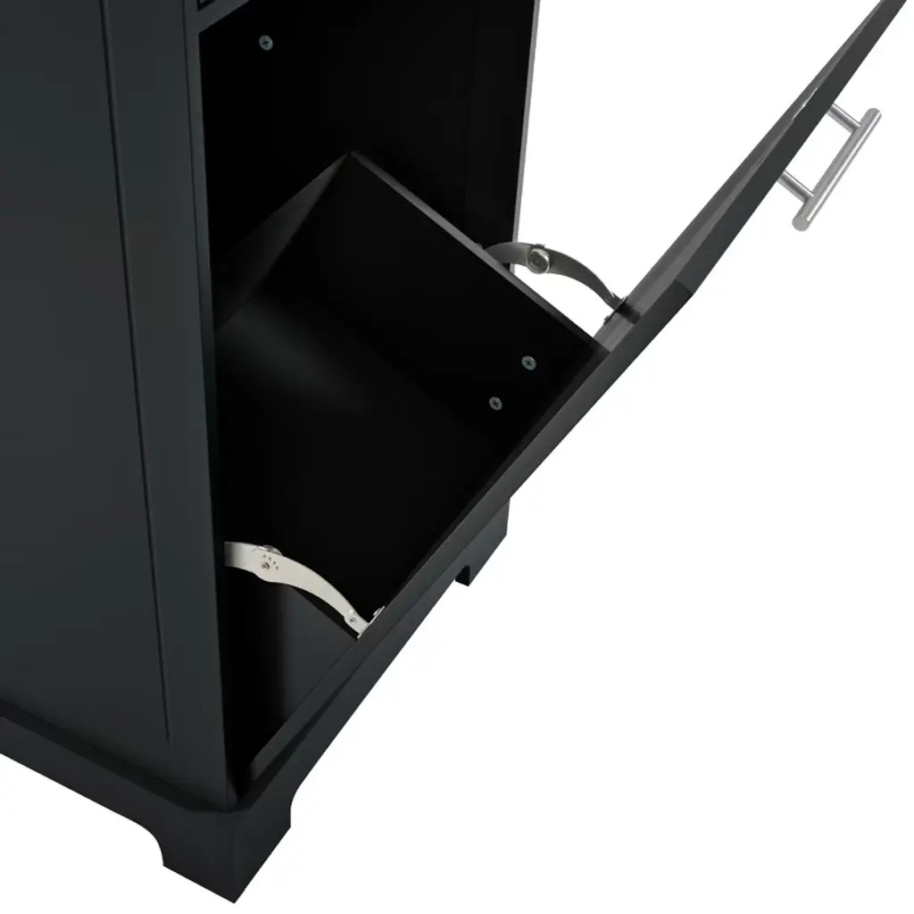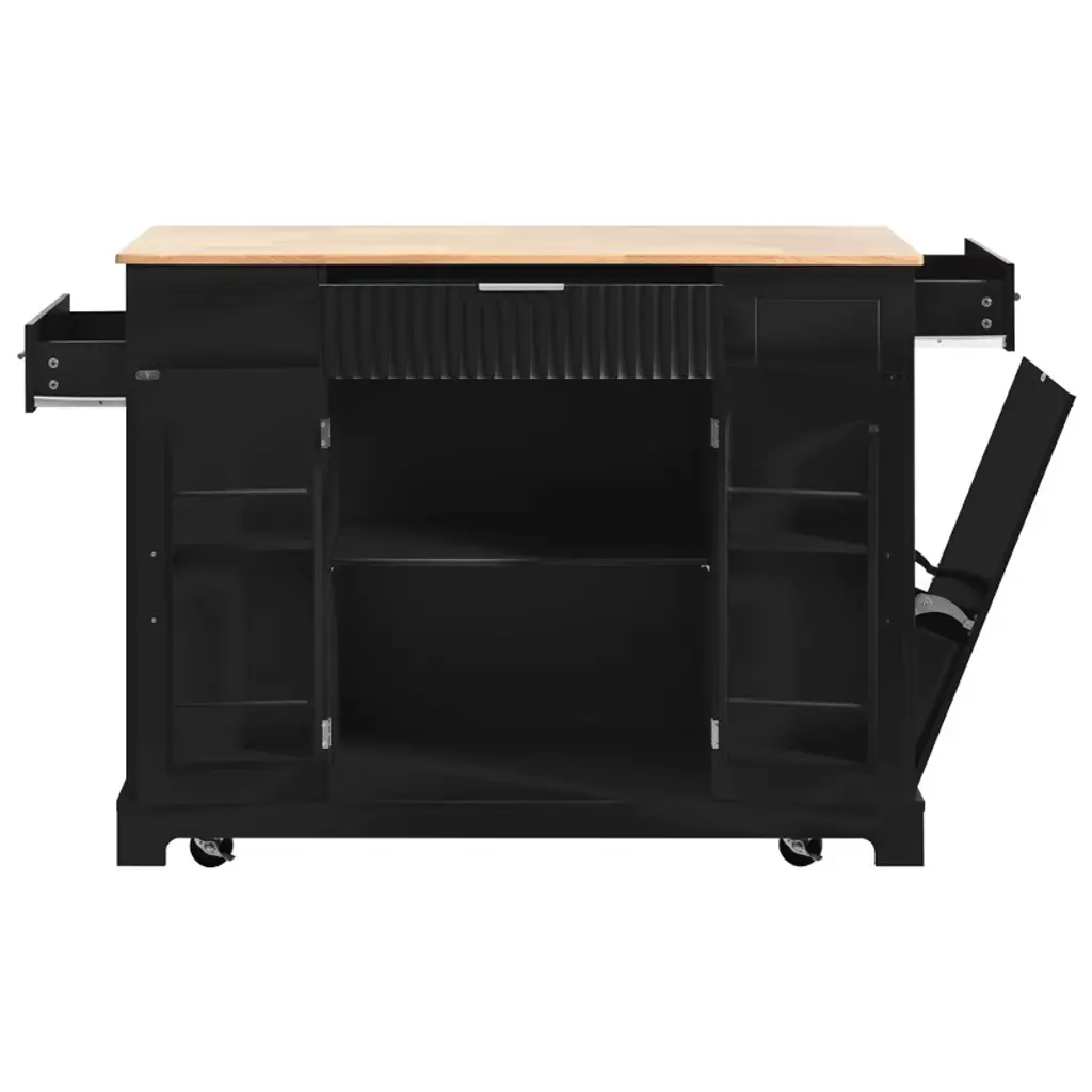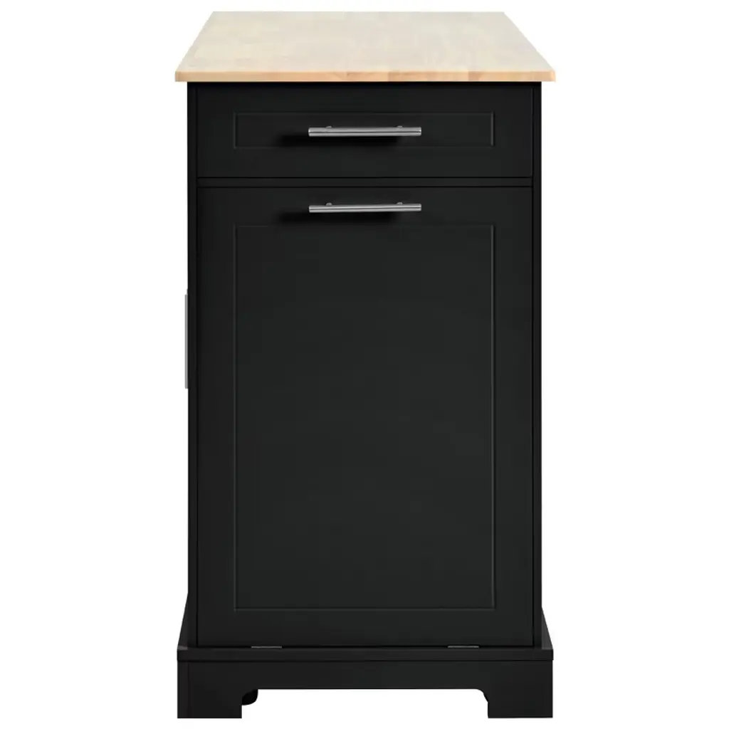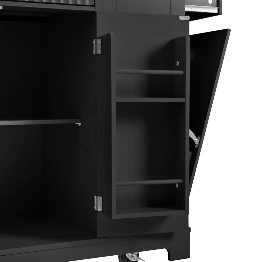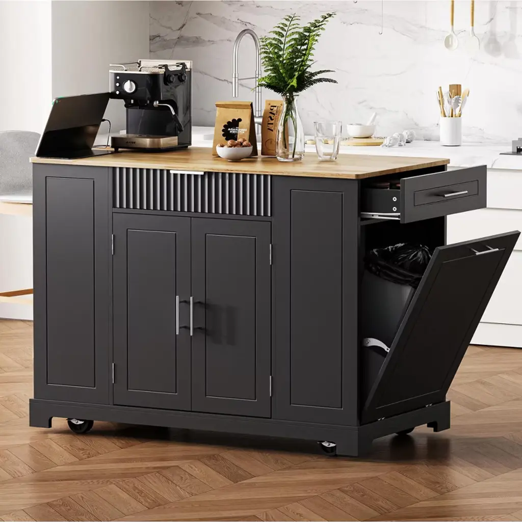 Maliang Kitchen Island With Trash Can Storage Cabinet, Power Outlet, Internal Storage Rack, 3 Drawer, 3 Open Side Racks, Garbage Bin, Black