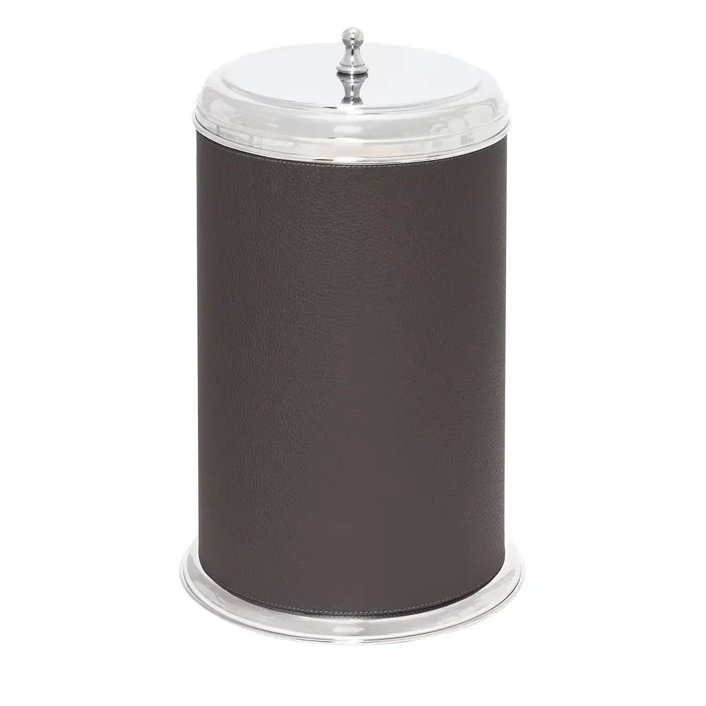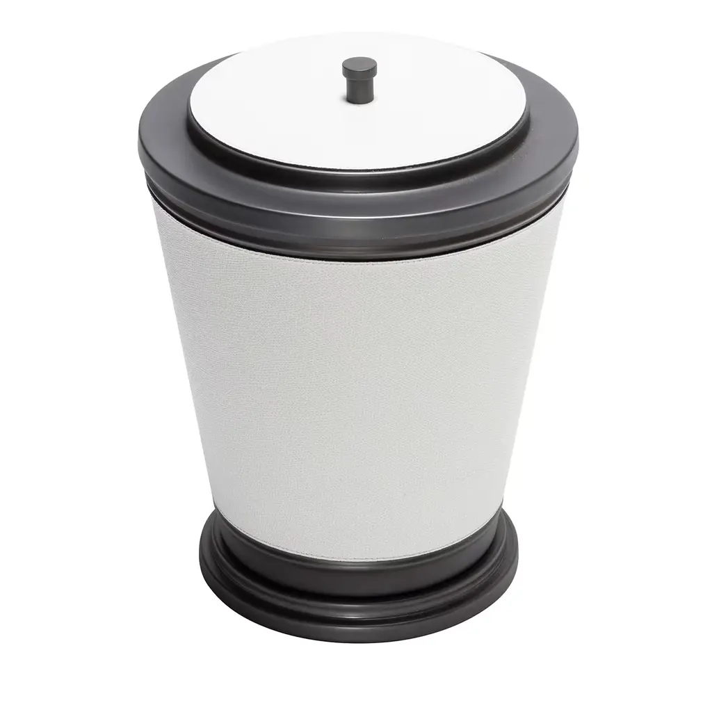 The pieces belonging to this bathroom set boast a characterizing inverted truncated cone metal structure with fine leather inserts. Featuring a series of decorative protrusions and indentations, the Manhattan collection retains a typically modern architectural appeal. Partially leather-covered metal structure. Non-slip waterproof rubber base underneath.