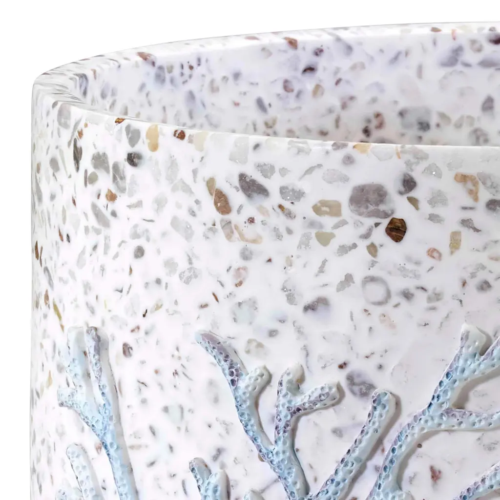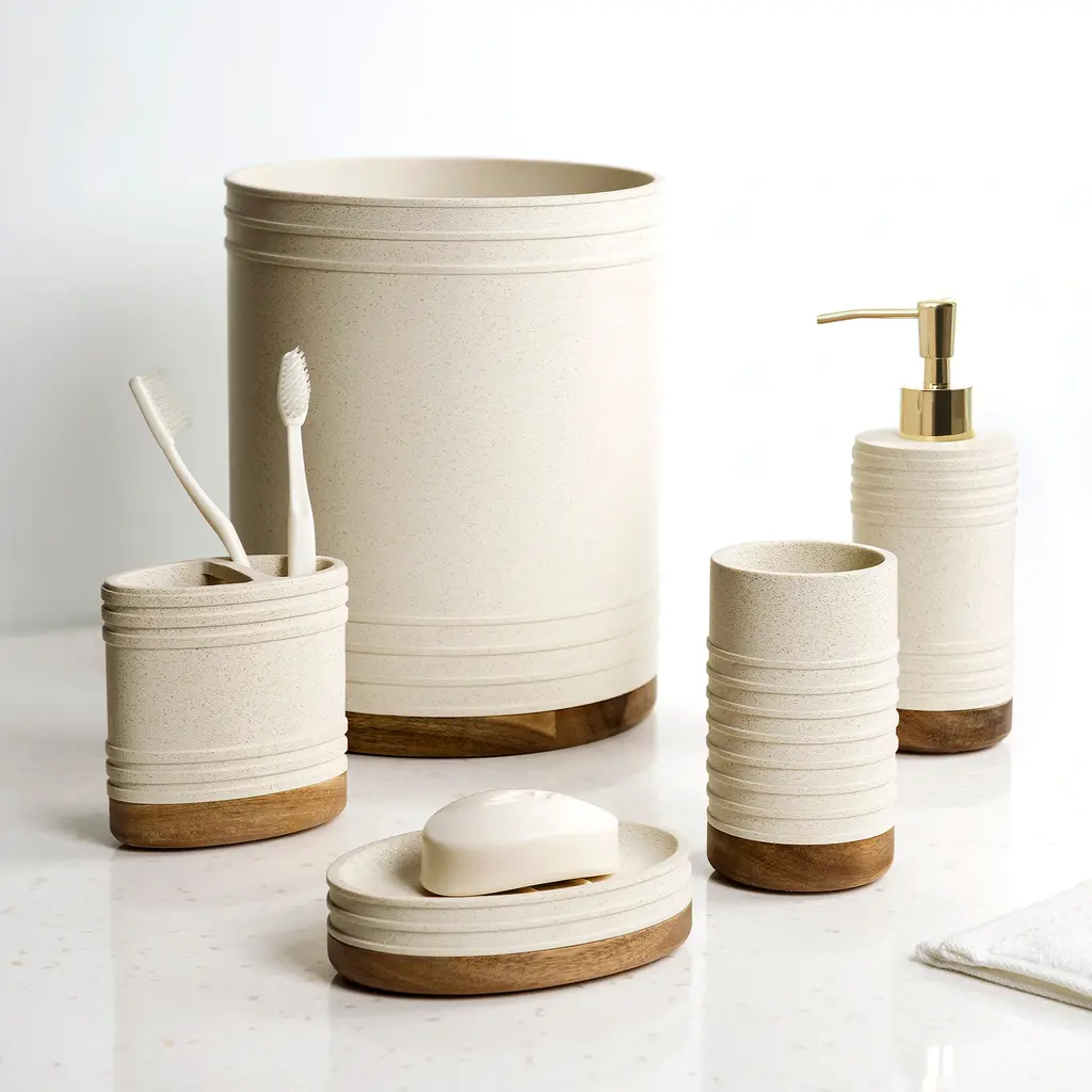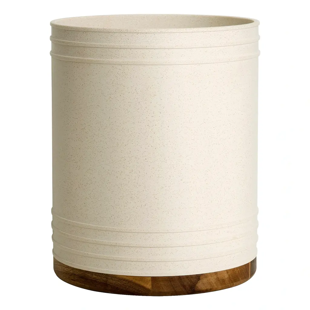 Bring a warm rustic look and natural appeal to your bathroom with the Marson Wastebasket by Allure Home Creation. This cylindrical wastecan, made of resin mixed with sandstone in a light beige stone look, is embossed with horizontal bands for added texture and enriched with a wooden base. Both decorative and functional, this piece will work well in your bathroom, bedroom, office, kitchen or any room where you need a receptacle and will easily fit in most spaces. Use alone or coordinate with other matching pieces in the Marson Bath Accessory Collection. Spot or Wipe Clean.