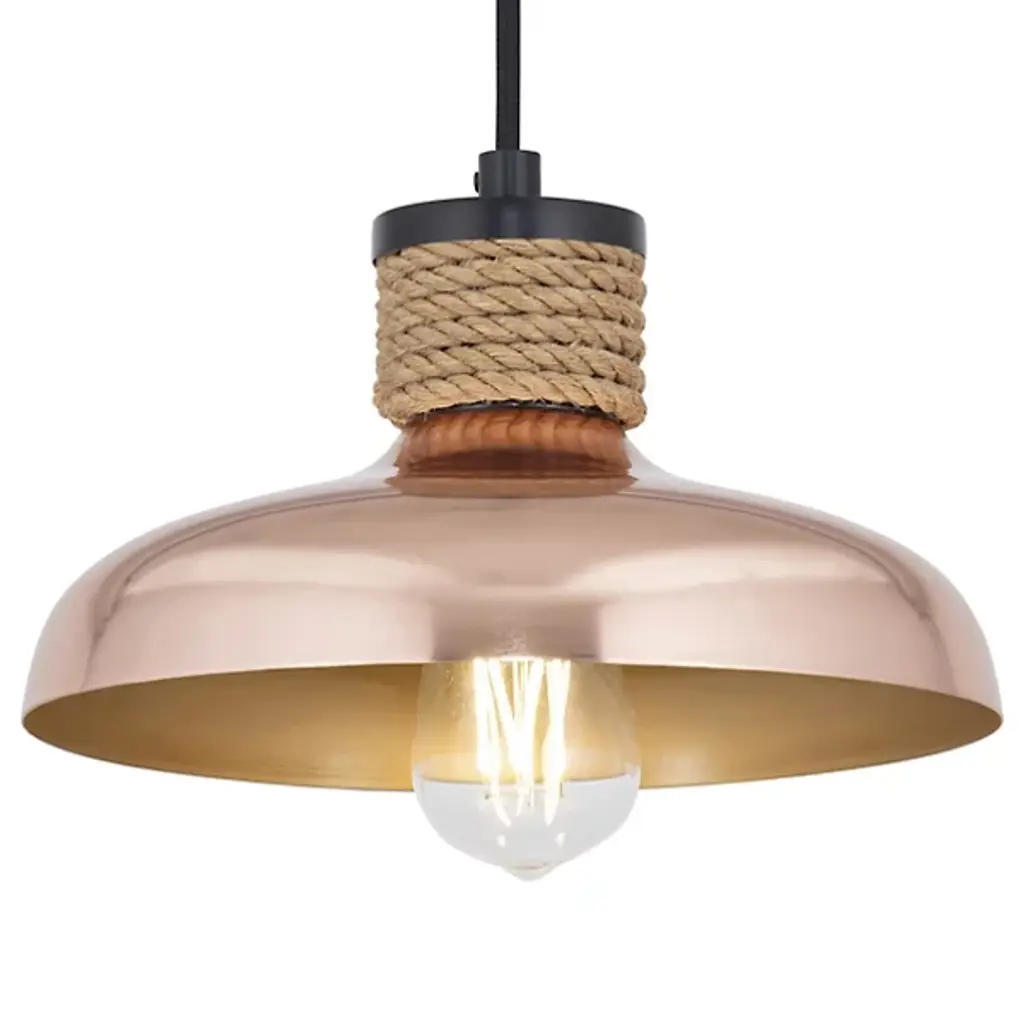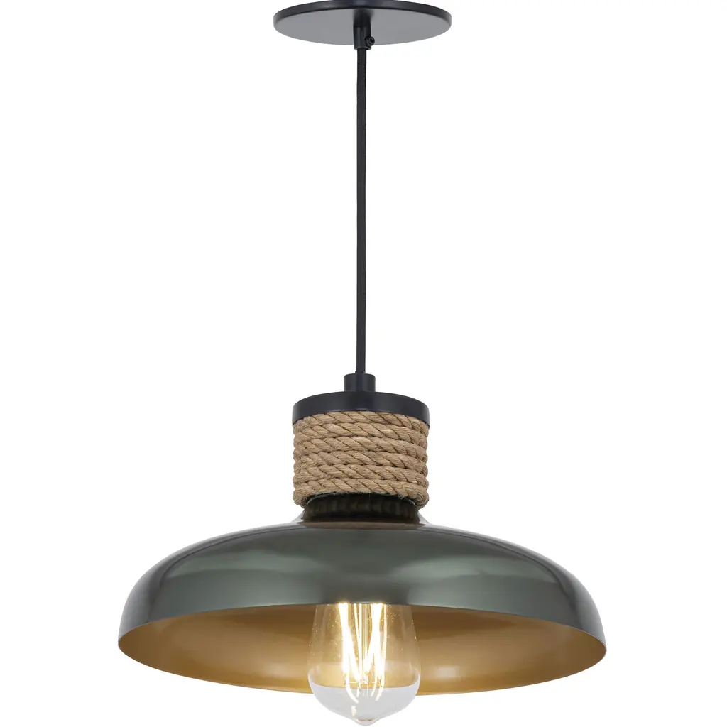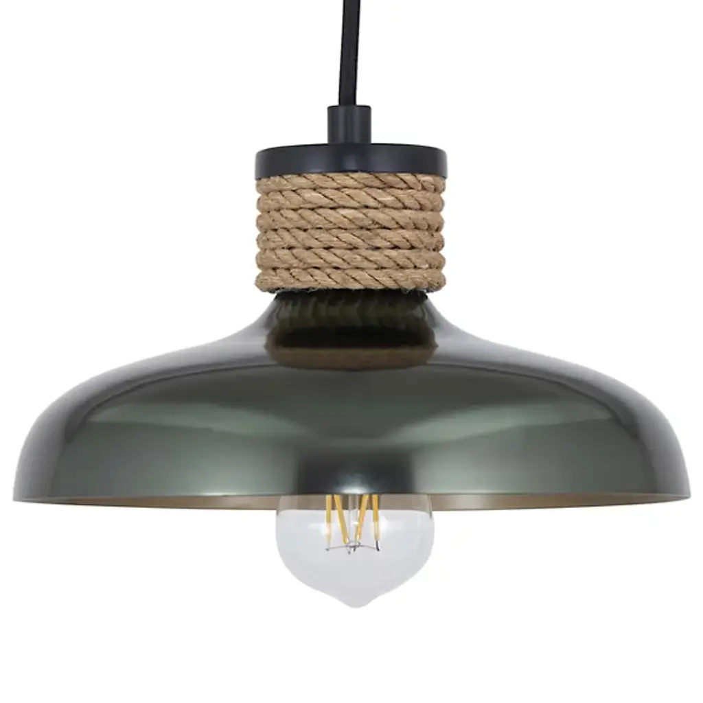 Drawing inspiration from industrial warehouse or farmhouse lighting, these classic shades feature a rayon fabric adjustable cord and hand-wound rope detail. The rustic elements are paired with spun metal shades.Features:Dimensions:Electrical Specifications: