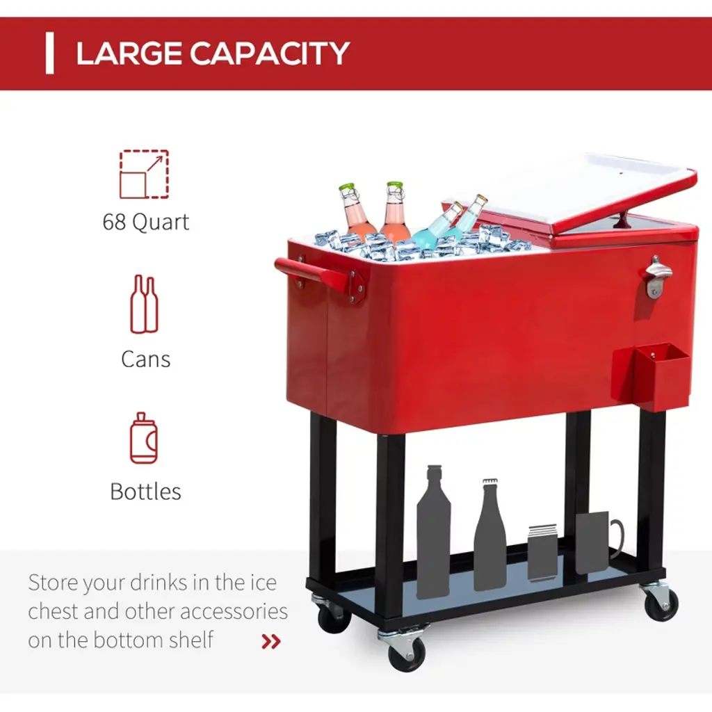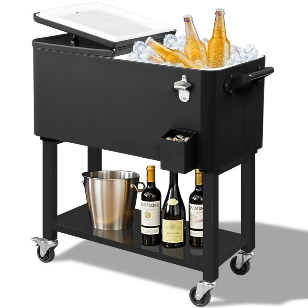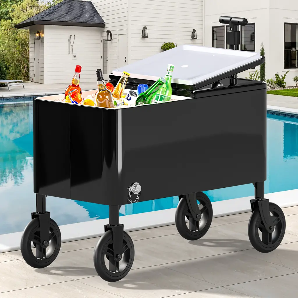 Plenty of Space Inside: The perfect spacious cooler with a large 80 quart/20 gallon capacity to hold a ton of ice and beverages in your backyard, poolside, and more. 4 Wheels for Easy Transport: Comes with four rolling wheels making it easy to move, with wheel locks so that it stays in place on your patio. Handy Bottle Opener/Cap Catcher: Located on the front right side is a built-in bottle opener and cap catcher for a quick and convenient cool-down. Drain Plug for Easy Removal: It features a handy drain plug that allows you to quickly and easily remove water from the cooler. Matches Your Existing Decor: Our coolers come in a variety of stylish colors to match your existing outdoor furniture including our own.