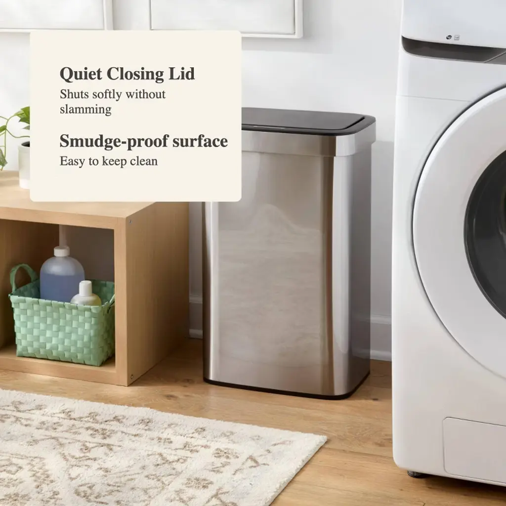 Help keep your kitchen, laundry room or any other space clean with this Motion Wastebasket without Liner from Brightroom™. Made from fingerprint-resistant stainless steel with a silver finish, this wastebasket features a quiet-closing, motion-activated lid for easy, hands-free use. It's designed with a 45-liter capacity to store plenty of trash and requires four AA alkaline batteries.Brightroom™: See your space in a new light.