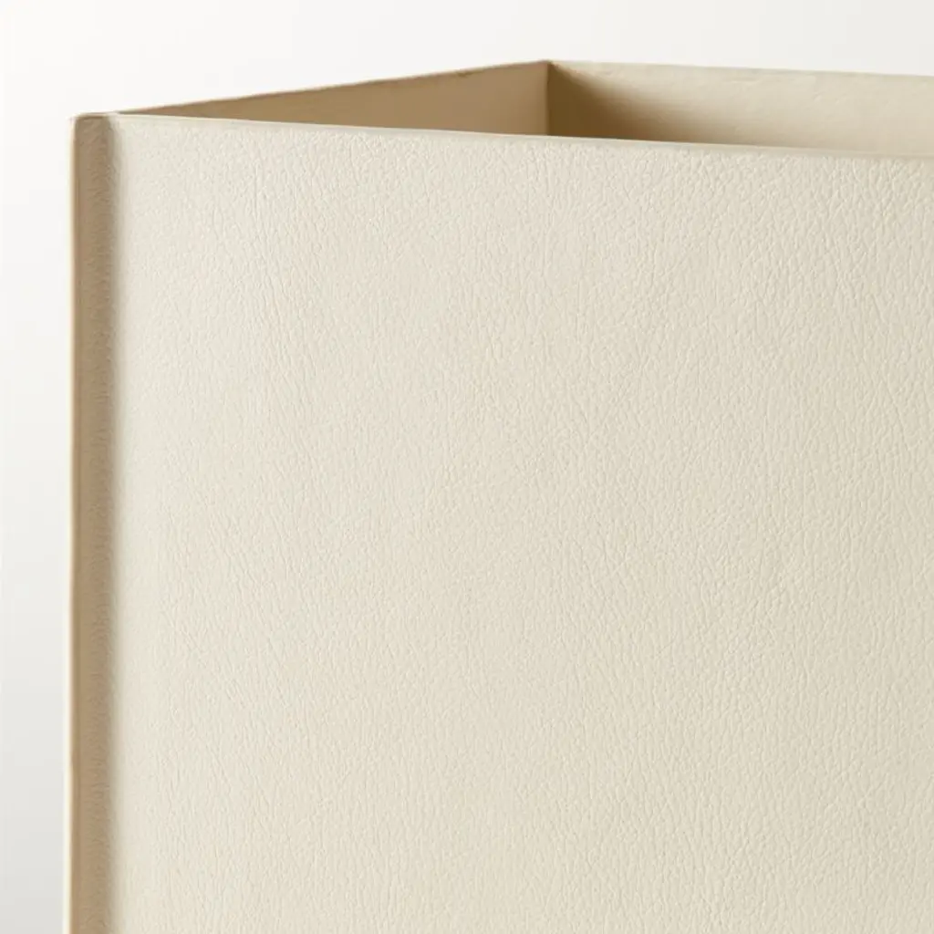 Wrapped in supple full-grain bison leather, ivory wastebasket by Barcelona-based Mermelada Estudio brings a natural richness to the home office. Leather is stamped on the bottom with the designer's logo for a subtle, elevated detail. Pair with the leather desk blotter and letter tray for a coordinated look. CB2 exclusive.