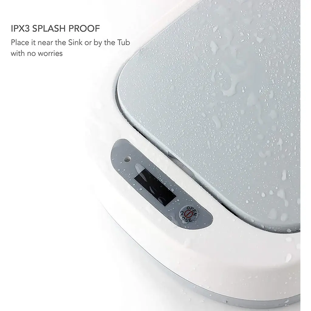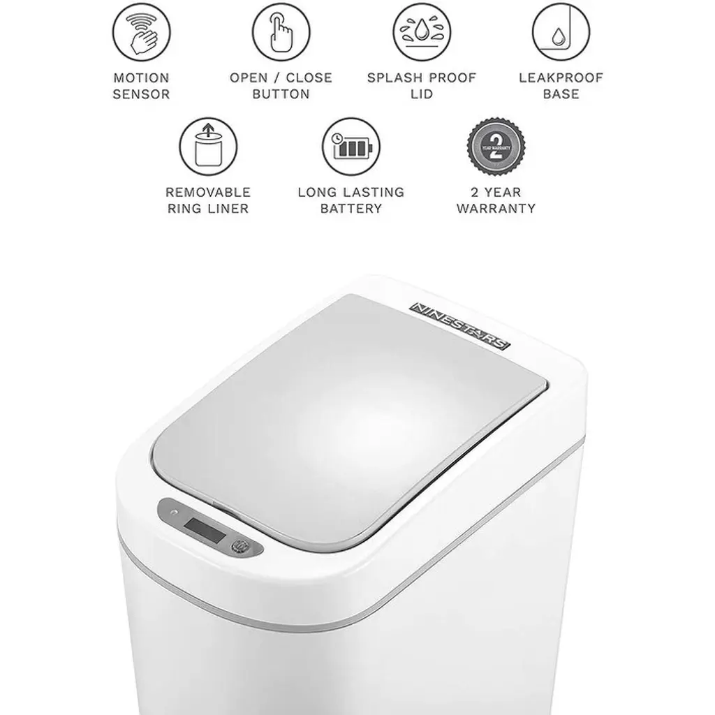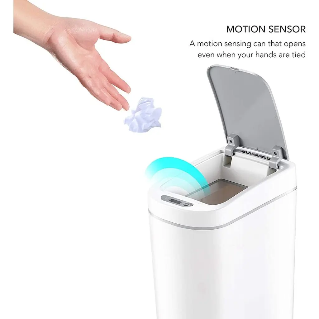 Two-piece matching set Hands-free lid opens with a simple wave of the hand IPX3 splash-proof lid and slim design make it perfect for compact and wet area LED digital display with touch button Advanced infrared technology preserves battery life Removable ring liner keeps trash bag securely in place Built-in manual mode keeps the lid open longer for bigger cleanups Leak-proof base prevents spills and makes cleaning easier Color White Compact for Small Spaces
