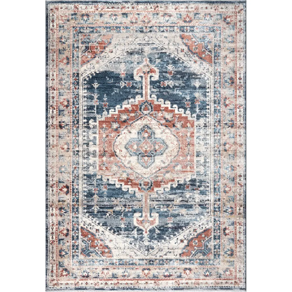 Indulge in the regal charm of this vintage medallion area rug. Channeling the flair of yesteryear with a stonewashed finish and delicate fringe, each piece has the look of a rare vintage find. Pair with traditional or modern decor, this floor covering is extremely versatile. Machine made in Turkey of soft polypropylene and is built to last in high traffic areas of your home. Never settle for anything but perfection with our pet-friendly and easy to care for area rugs.100% Polypropylene, made in TurkeyDesigned with resilience against everyday wear-and-tear, this rug is kid and pet friendly and perfect for high traffic areas of your home such as living room, dining room, kitchen, and hallwaysSleek and functional .31" pile height allows for convenient placement in entryways, underneath furniture, and will not obstruct doorwaysEasy to clean and maintain, we recommend vacuuming regularly and spot treating any mild stains with carpet cleanerWe recommend using a rug pad to provide extra cushioning and to prevent any possible slipping and sliding on your flooring. Rug pads serve as protective layering piece for your floor and your rug from any wear and tear, extending the life of your rug.