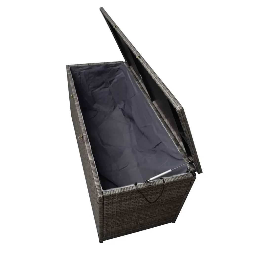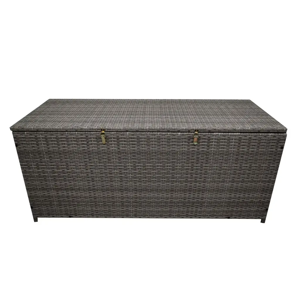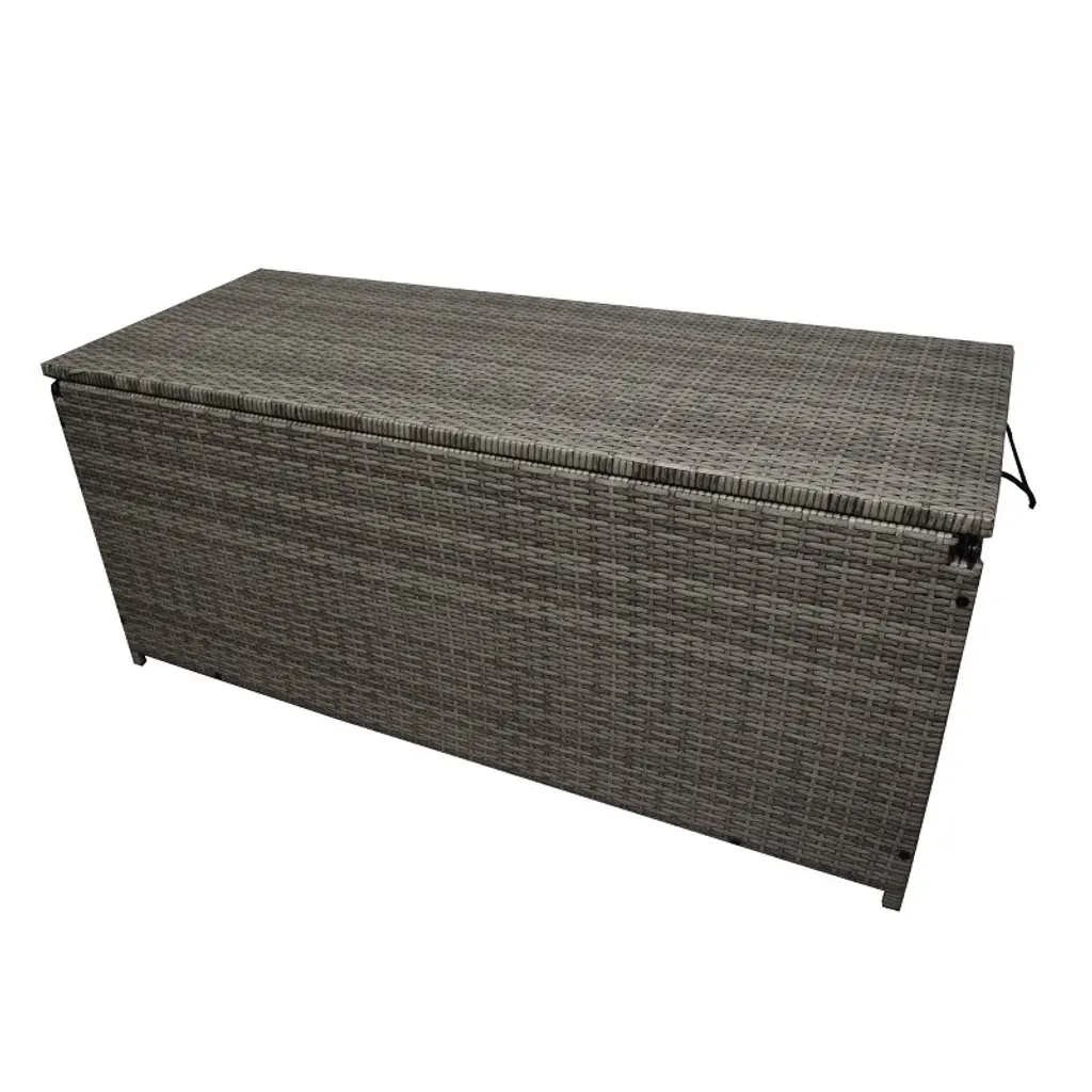 Bring a natural element into your home with our UV Resistant Outdoor Gray Resin Wicker Storage Trunk/Chest/Box/Bin. This stylish deck box is perfect for any room. Use it indoors to store extra blankets, pillows or towels in a guest room bathroom or outdoors to enhance the appearance of your backyard. This wicker trunk features a metal frame with tightly woven resin wicker panels. Hinged top lid allows for easy opening convenience. The top also features a pneumatic hinge to prevent the top from flipping backwards and supports for smooth closing. Handles on both sides of the trunk make portability easy. Outdoor Gray Wicker Storage Bin Dimensions: 53"L x 22"W x 24"H, 27 lbs, 113 gallon