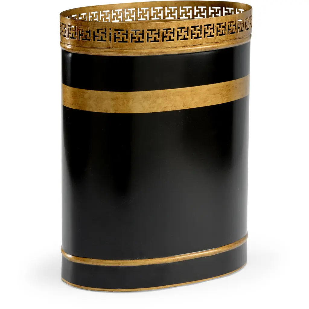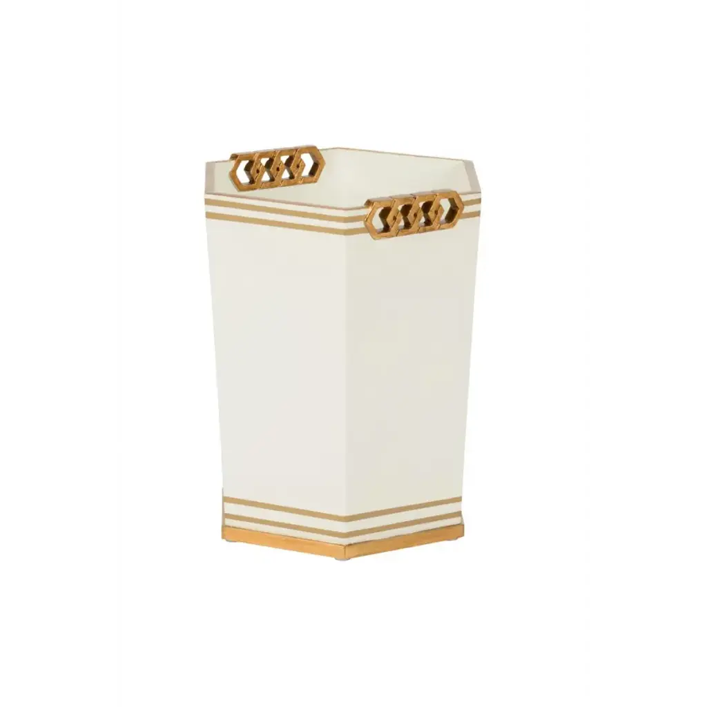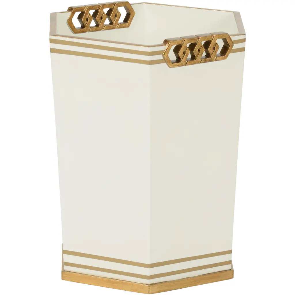 CLASSIC AND TAILORED, THIS BEAUTIFUL WASTEBASKET DESIGNED BY SHAYLA COPAS FEATURES GOLD BANDS AND INTERLOCKING GOLD ACCENT.