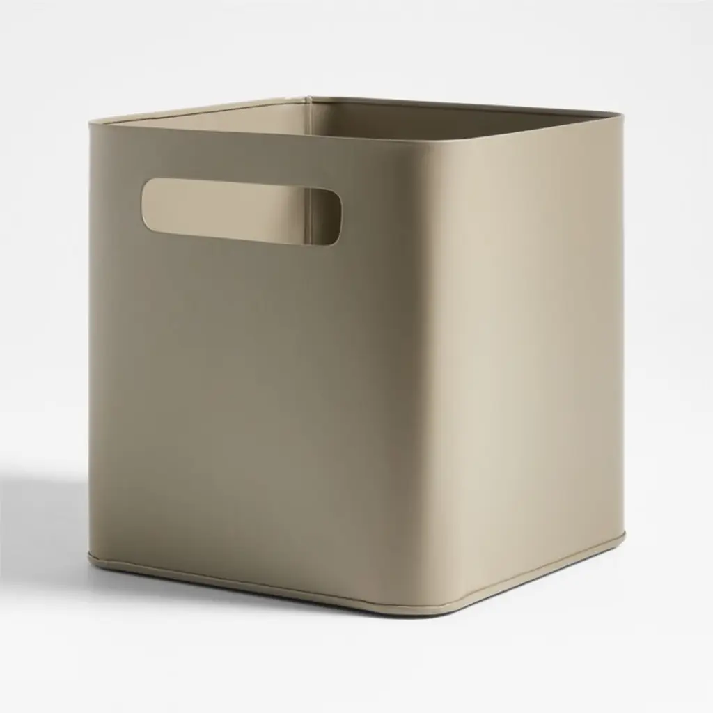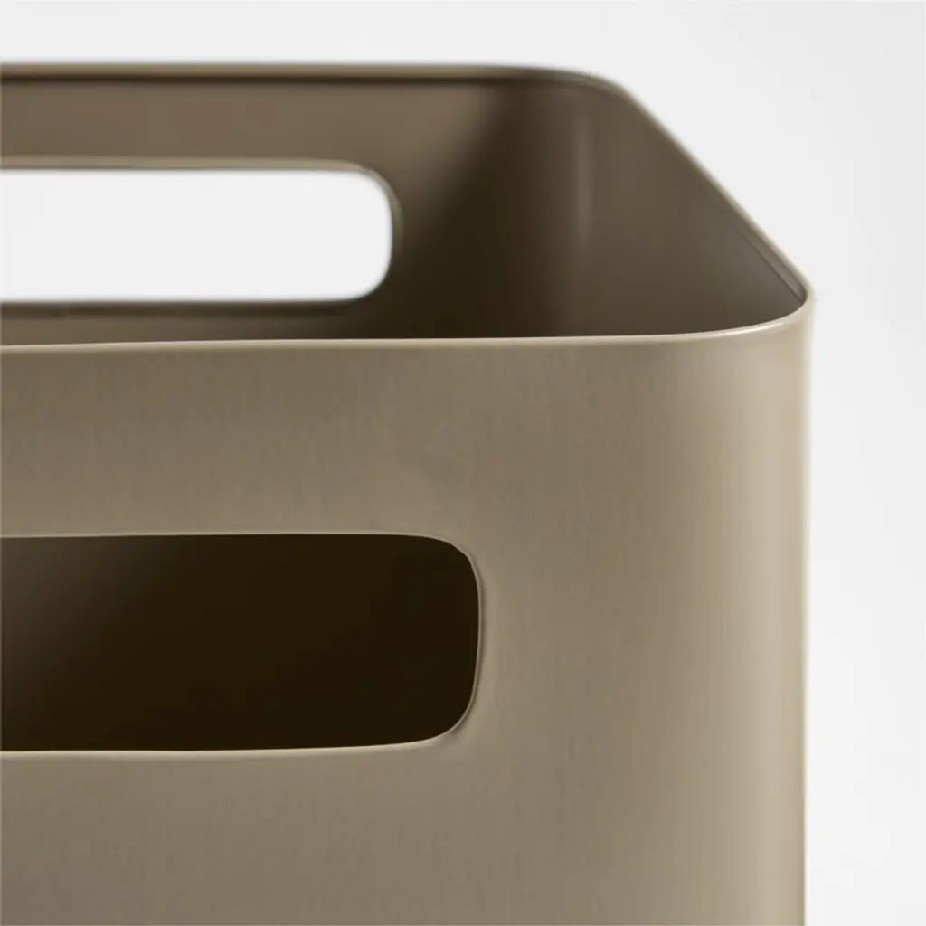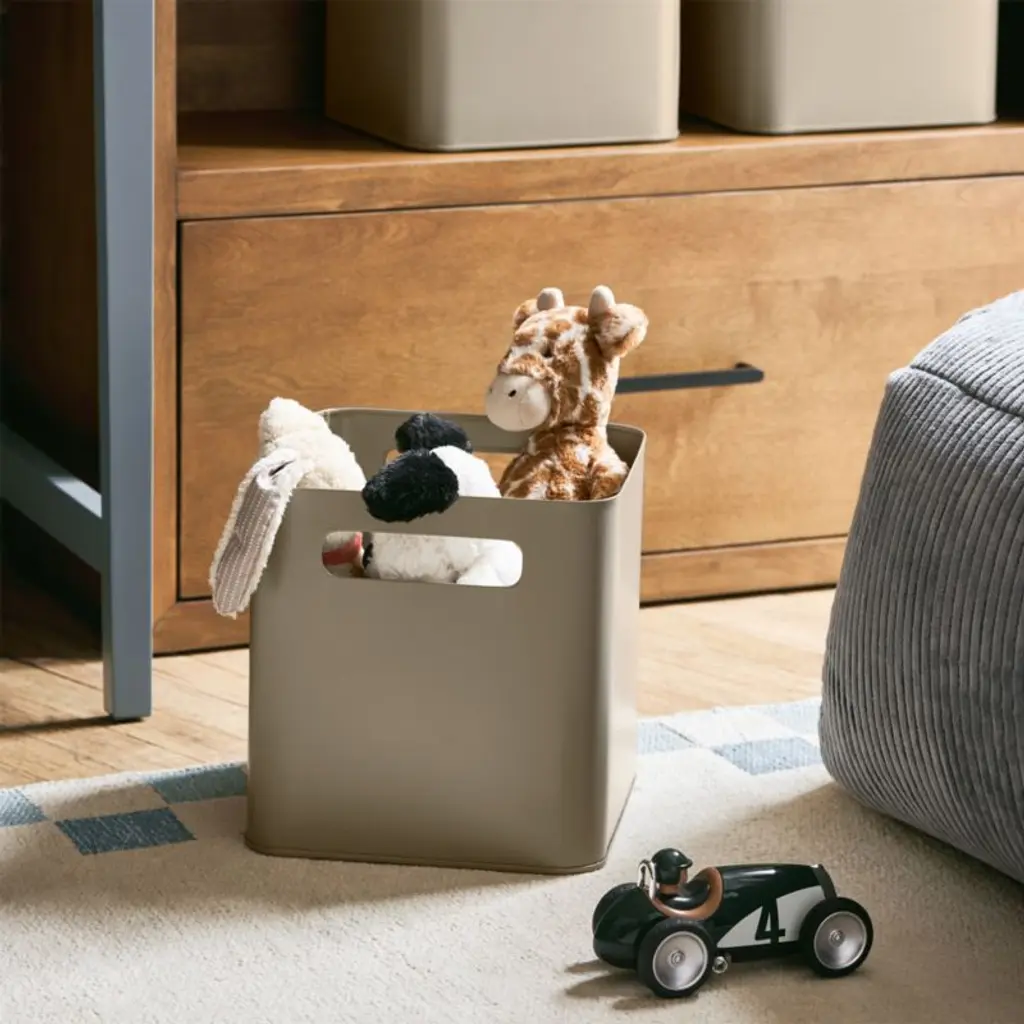 Contain anything and everything with our simple, stylish Outline metal storage bin. Designed for versatility and built to handle years of use, the clay brown iron bin is deep enough to keep books upright, craft supplies organized or study essentials always where you need them. The fun color and rounded edges look great and slide into a bookshelf cubby or kid's desk. Cutout handles on each end are easy for little hands to grip. Our exclusive bin also serves as a video game storage solution for older kids.