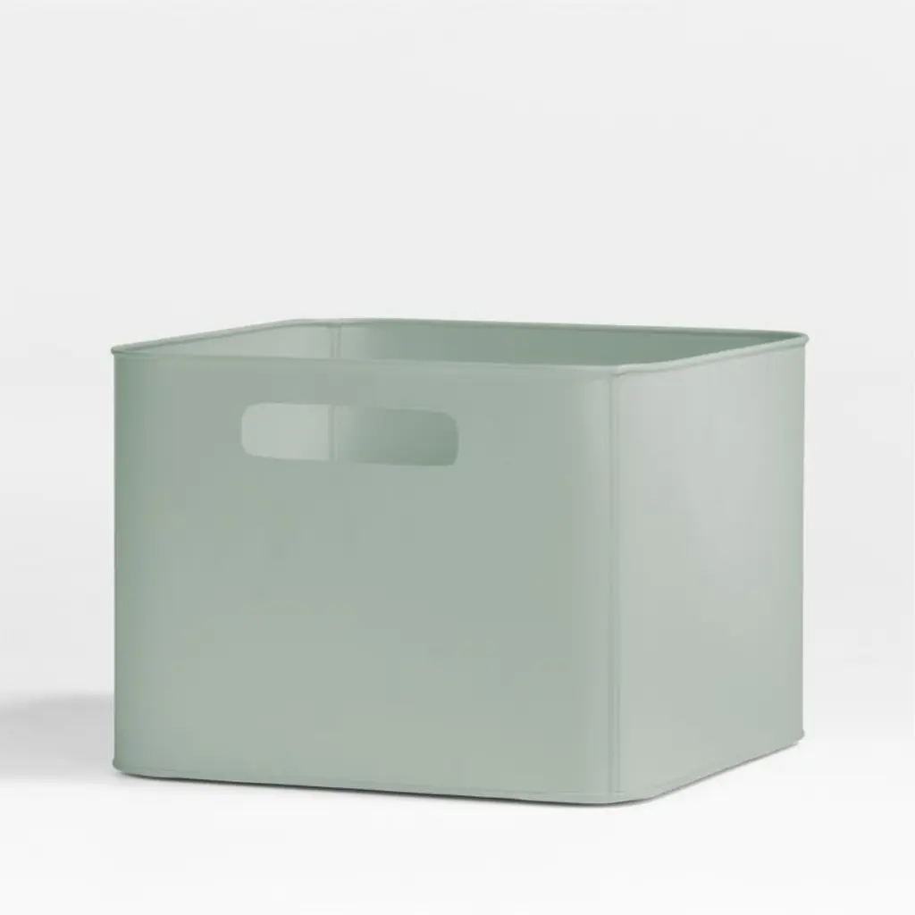 Contain anything and everything with our simple, stylish Outline Metal Storage Bin in an earthy sage hue. Designed for versatility and built to handle years of use, the metal bin is deep enough to keep books upright, craft supplies organized or study essentials always where you need them. Cutout handles on each end are easy for kids' hands to grip. They're minimal, functional and totally convenientpurchase multiple to stack them vertically, saving precious floor space.