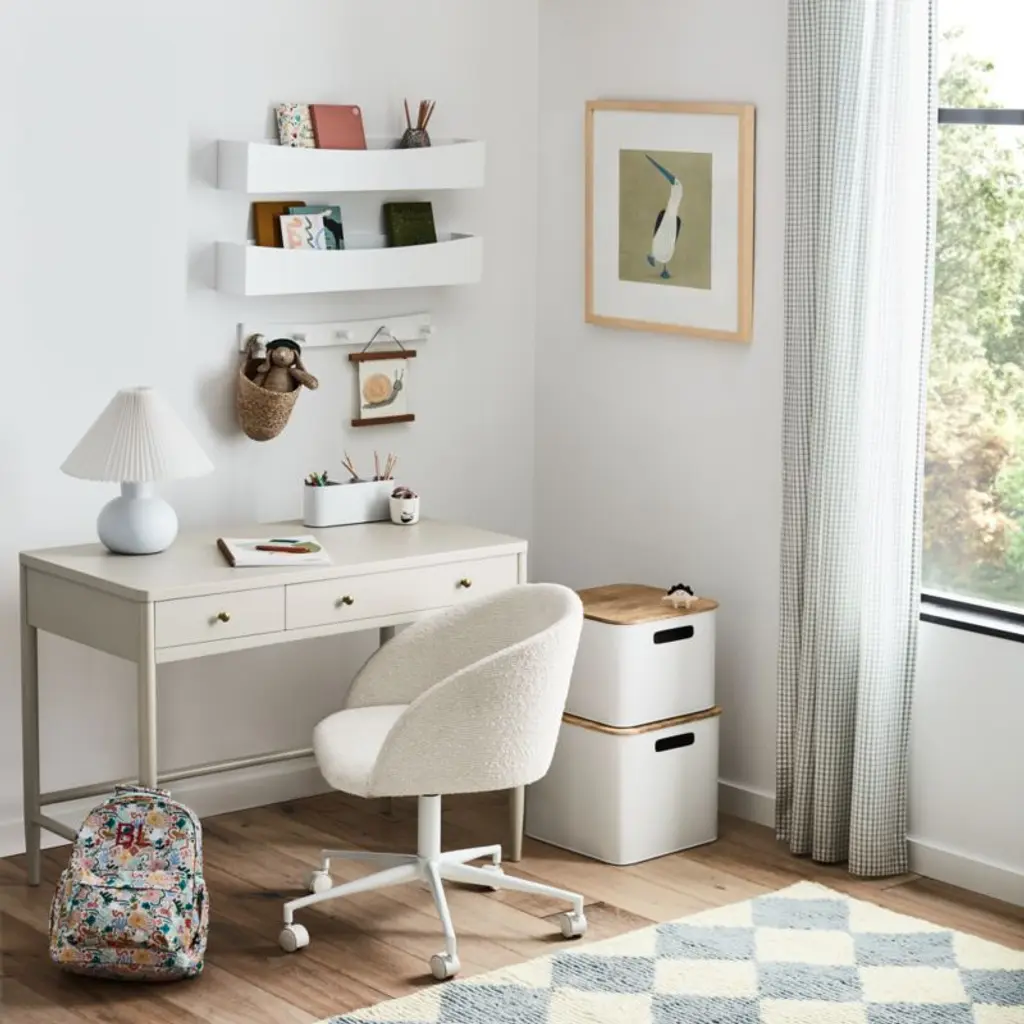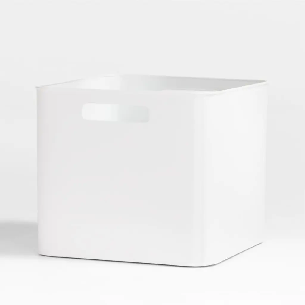 Contain anything and everything with our simple, stylish Outline metal storage bin. Designed for versatility and built to handle years of use, the white iron bin is deep enough to keep books upright, craft supplies organized or study essentials always where you need them. Cutout handles on each end are easy for kids' hands to grip. They're minimal, functional and totally convenientpurchase multiple to stack them vertically, saving precious floor space.