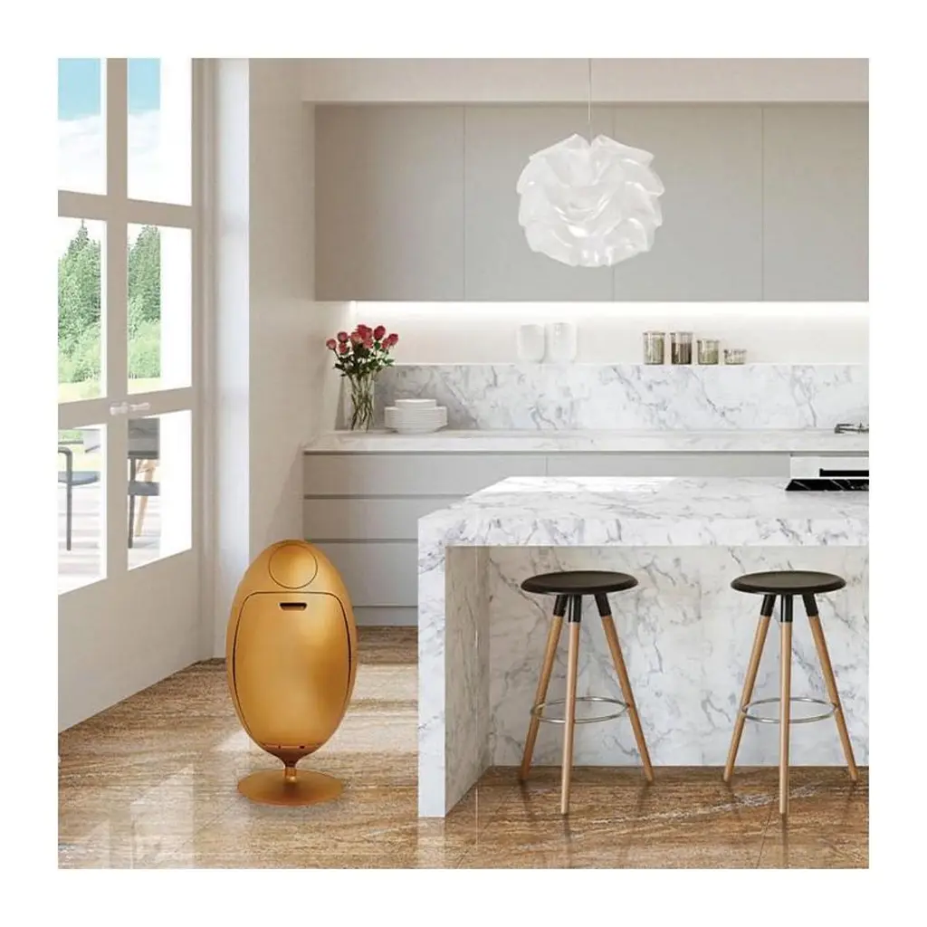 An unexpected luxurious touch, Ovetto Metal, the recycling container, is tinged with gold.The first designer recycling bin gets dressed in Gold, with an elegant and provocative finish, to become the absolute star of the space and highlight your sense for style and impactful design.Ovetto is space-saving; its curves are designed to place it comfortably in a corner, making it look better.Ovetto is designed to withstand. It has an average life span of 10 years.The dustbin becomes designer and thus matches by contrast with any fitted wall, a brick wall, brushed metal finishes or any textured surface.Ovetto metal gold is a focal point of any color palette, invigorating the atmosphere with light and brightening the decor of your home, office or business. Stylish, durable, practical and easy to use, discover Ovetto Metal Oro now.