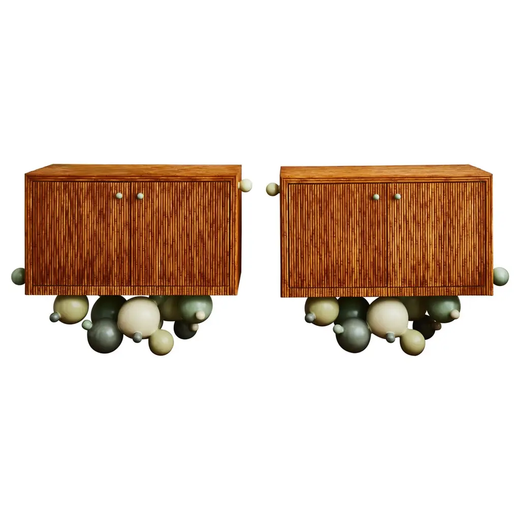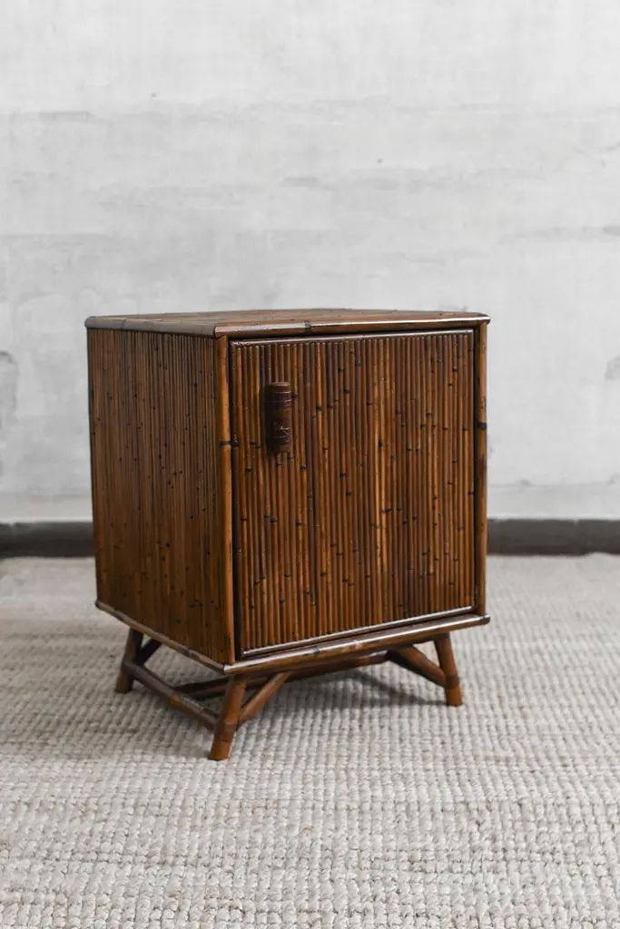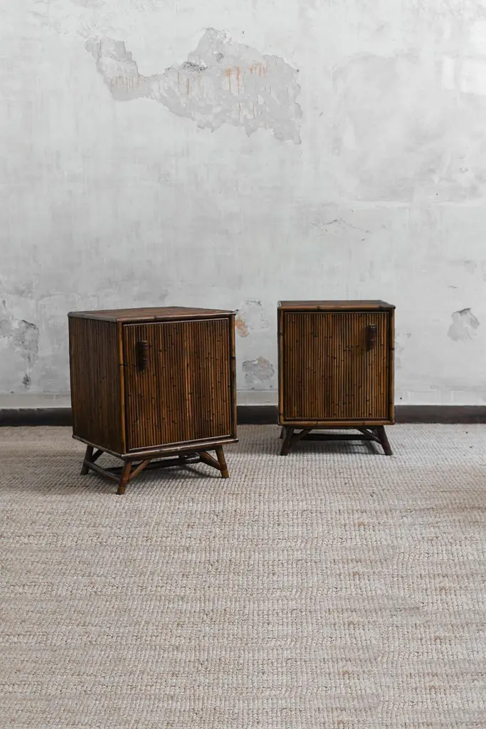 Pair of bamboo bedside tables with doors and leather bindings.Italian artisanal production.Product detailsDimensions: 50 W x 64 H x 50 D cmMaterials: bamboo, leatherProduction: Italian manufacturing.