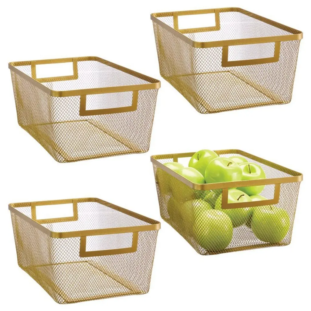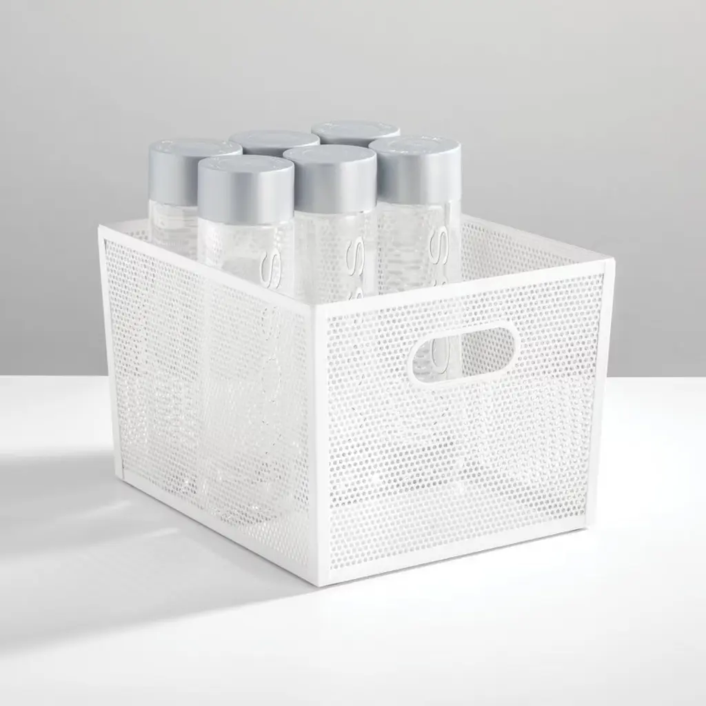 From basic to beautiful, give your space a boost with the highly versatile Perforated Metal Bin. This solution corrals everything from snacks and condiment bottles in the kitchen to linens and personal care items in the bathroom, keeping everything you need right at your fingertips. Crafted from durable steel, the perforated design is not only aesthetically pleasing but also provides visibility to items inside and ventilation if storing fruits and vegetables. This open design allows you to showcase your essentials in an organized fashion, lending function and beauty to your storage solutions. Sleek, integrated handles make it easy to transport while making a darling display wherever it is placed. Available in various sizes to suit your storage needs, these perforated bins accommodate an assortment of household odds and ends...and then some.