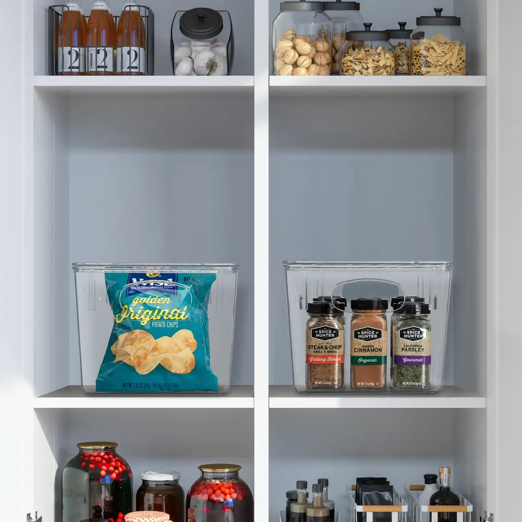 No more searching for that much needed ketchup bottle or juice box! The Sorbus Container Bin Set keeps your kitchen organized with a clear view. A translucent design allows you to quickly see what's stored inside and group contents by type. Store anything from fruits and veggies in the fridge to packaged goods and supplies in the pantry. Built-in handles make it easy to pull off shelves and carry around the home. When paired with included lids, bins stack to maximize space. For versatility, use them without lids as catchalls or convenient drawer organizers. Now go ahead and enjoy your neatly organized space.Multi-purpose storage for any space.Whether you’re stocking the pantry, making a grocery list, or tidying up household clutter, these container bins organize any room! In the kitchen, use them to keep food items ready for meal prep or so kids can easily grab their favorite juice boxes and snacks. For multi-purpose use, hold bathroom toiletries and cleaning products or to color-code that pile of crafts the way you've always wanted. The sleek clear look blends with most home décor for function and style.Durable clear design.StackableStacks to maximize vertical space.PortableCut-out handles for easy transport.Lid ClosureKeeps items contained and easy to remove.