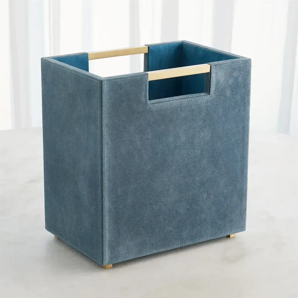 The Posh Wastebasket is luxuriously wrapped in dusty blue suede leather, blending practicality with sophistication in your living space. It features antiqued brass-finished handles and microsuede in the interior. From a fashion forward perspective, Global Views offers accessories, furniture, statement lighting, and an assortment of rugs and mirrors to add beauty and joy to your home.