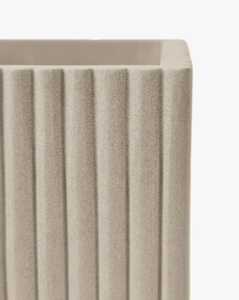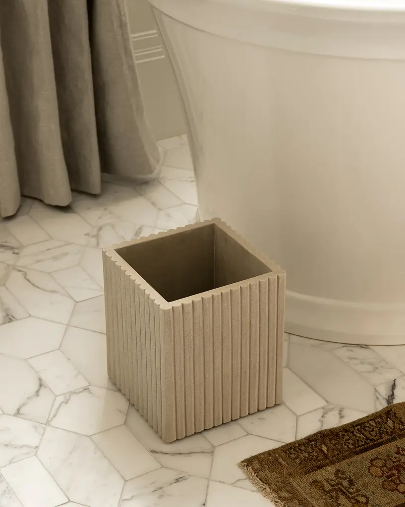 Playful yet weighty, the Prentiss Waste Bin is made from off-white mint sandstone. The ribbed sides and squared shape bring dimension and practical use to your bathroom styling.