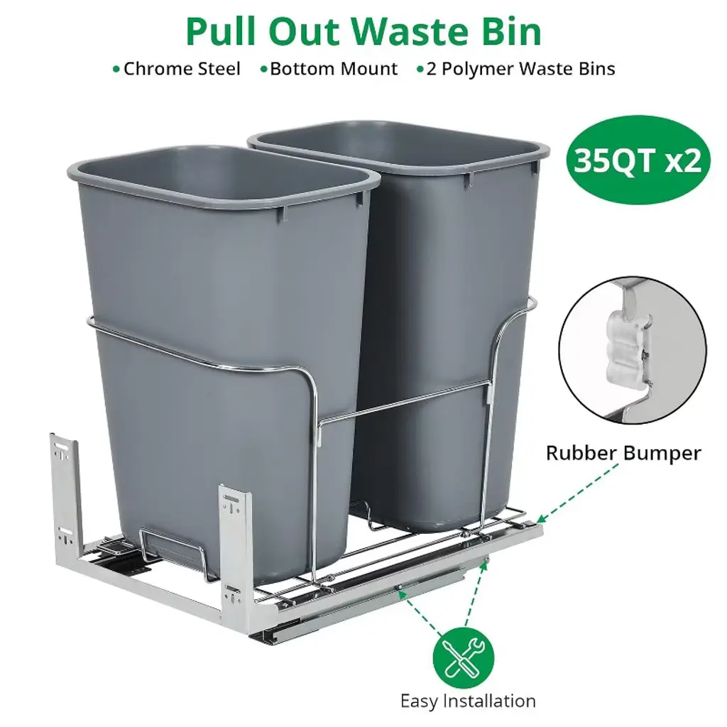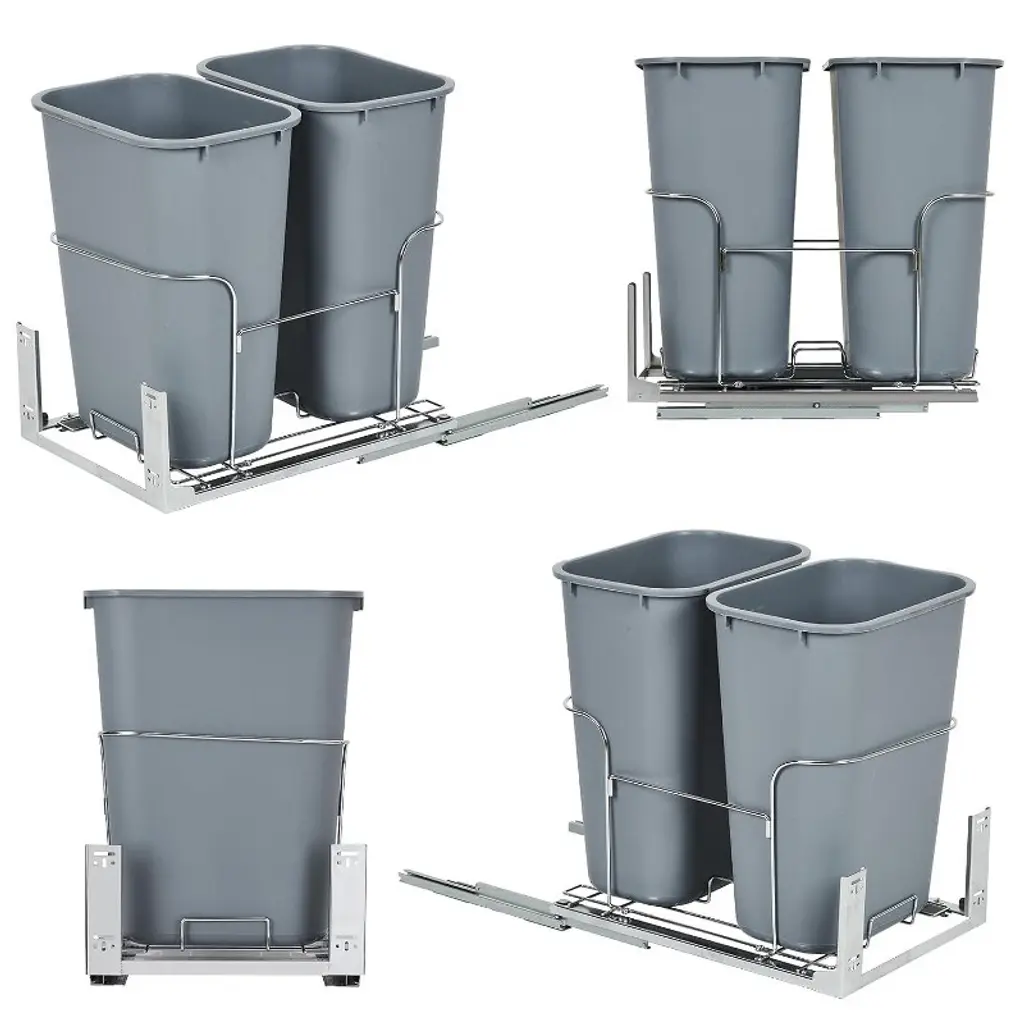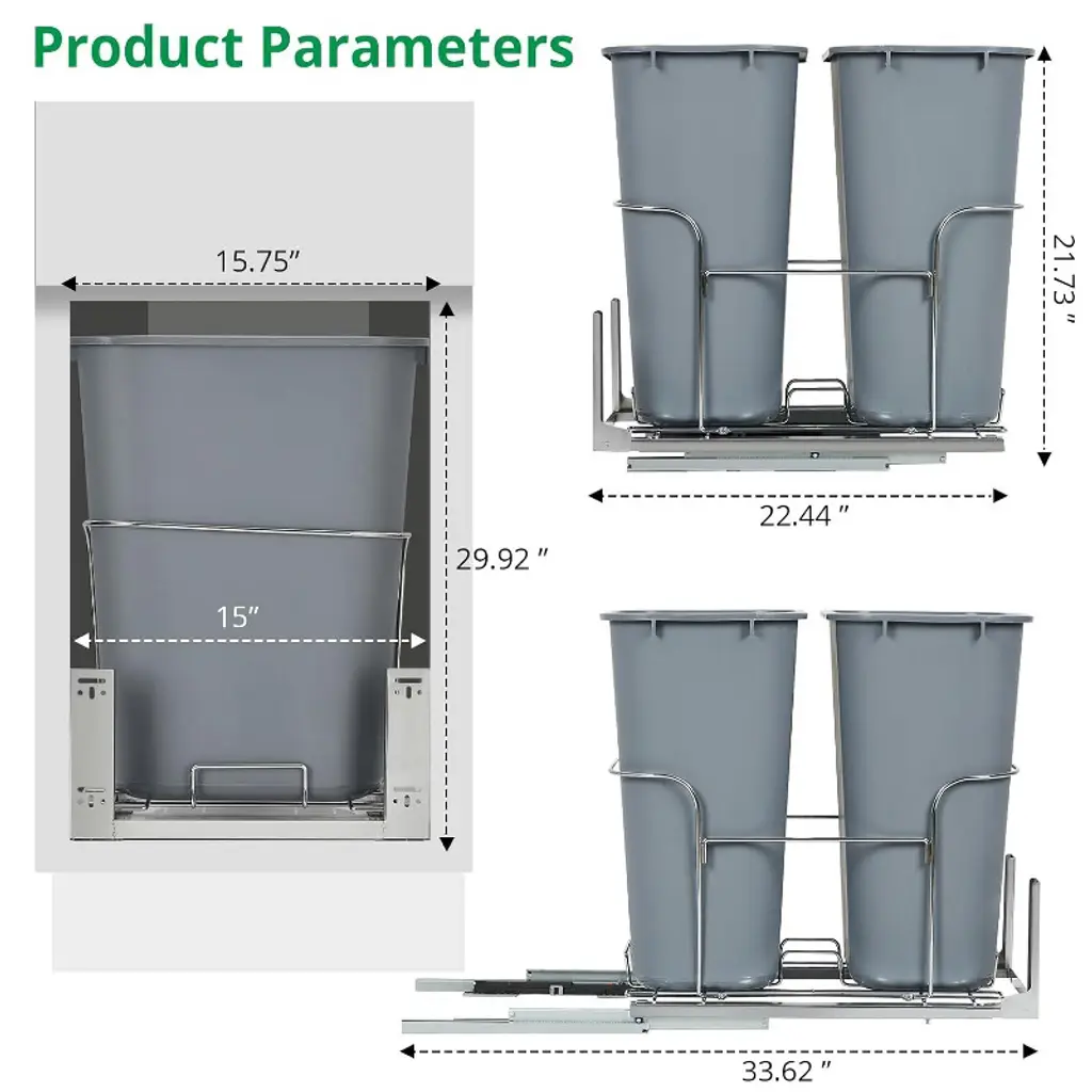 Tired of kitchen clutter? This dual-bin under-sink trash system hides waste/recycling in unused cabinet space – whisper-quiet slides keep it gliding smoothly while tucking messes out of sight in apartments or tight kitchens. Highlights at a glance: Space-saving design fits neatly under sink or cabinet, keeping kitchens organized Dual large-capacity bins separate trash and recycling for easy waste management Heavy duty steel slides ensure smooth, quiet operation every time Durable PP buckets built to withstand daily use without cracking or leaking Simple assembly with clear instructions and all hardware included Specification: Capacity: 2x25 / 2x35 QT Size: 15.35x24.02x17.13 / 15x21.65 / 15.87x20.94x19.69 / 15.35x24.02x21.65 / 15x22.44x21.73 inches Color: black / grey Material: PP+steel