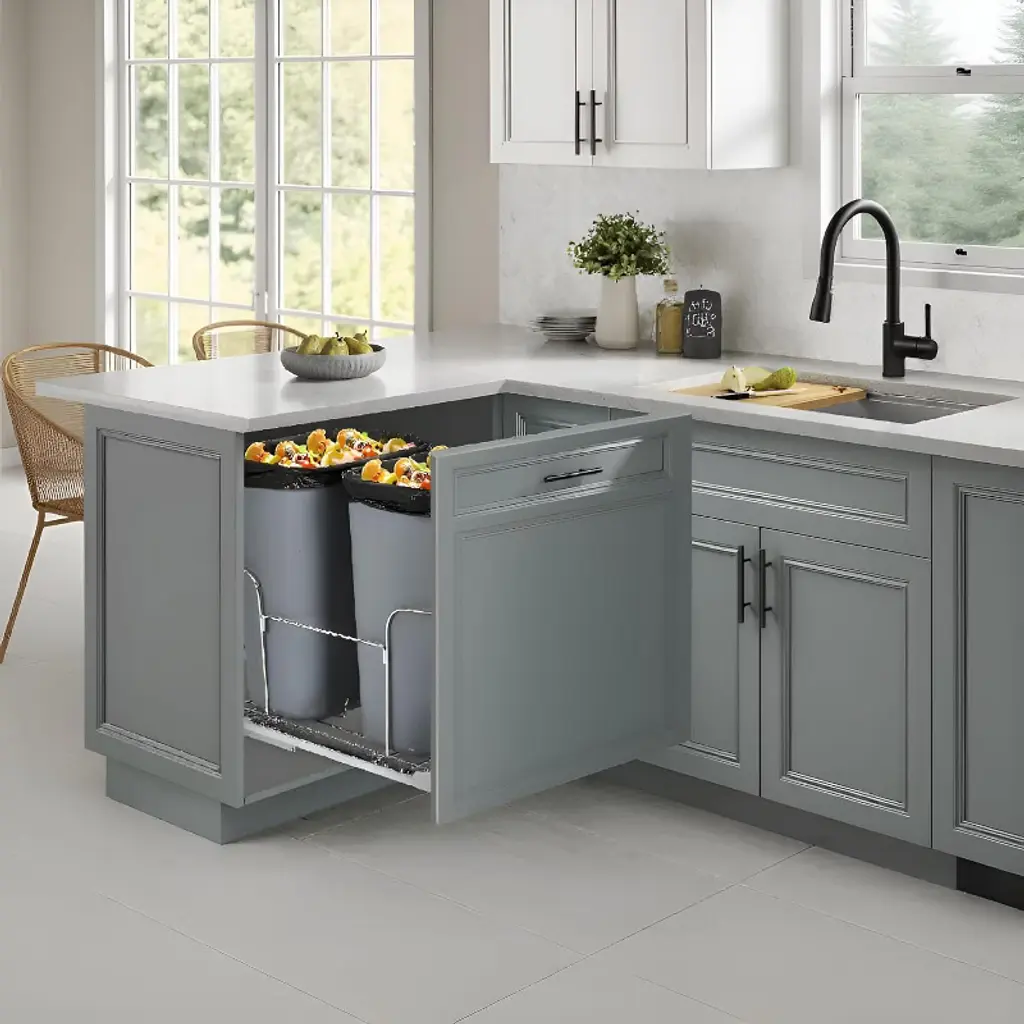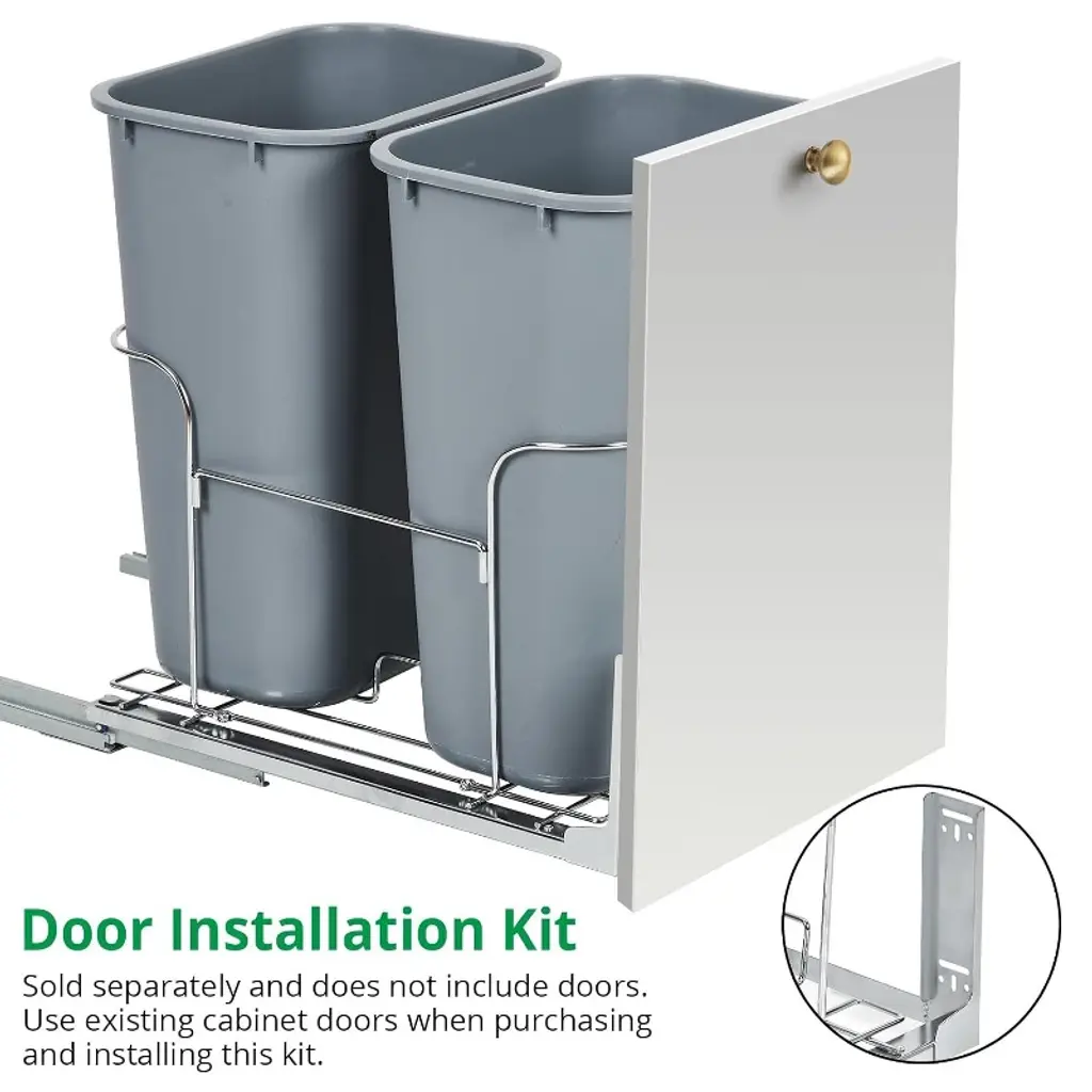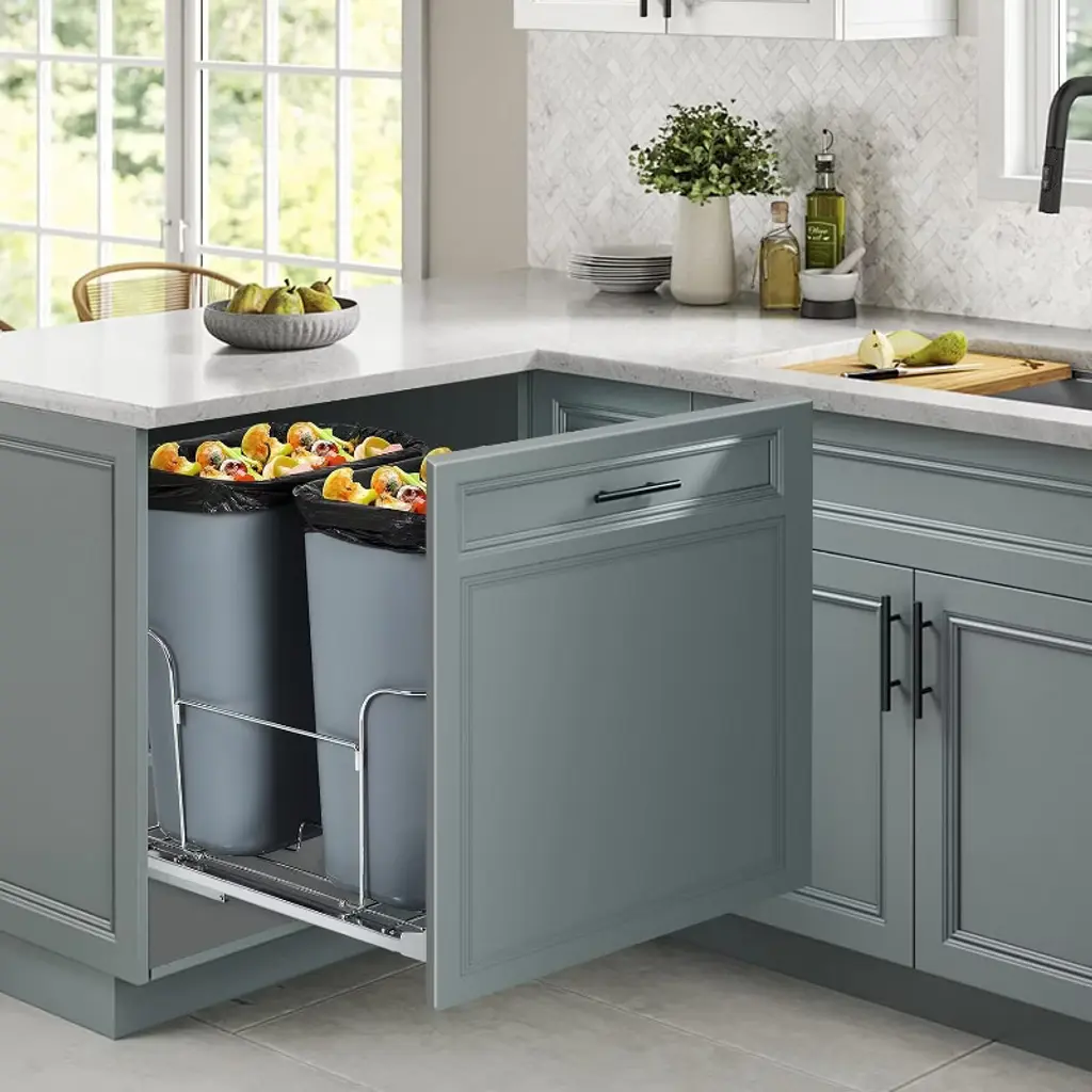 Tired of kitchen clutter? This dual-bin under-sink trash system hides waste/recycling in unused cabinet space – whisper-quiet slides keep it gliding smoothly while tucking messes out of sight in apartments or tight kitchens. Highlights at a glance: Space-saving design fits neatly under sink or cabinet, keeping kitchens organized Dual large-capacity bins separate trash and recycling for easy waste management Heavy duty steel slides ensure smooth, quiet operation every time Durable PP buckets built to withstand daily use without cracking or leaking Simple assembly with clear instructions and all hardware included Specification: Capacity: 2x25 / 2x35 QT Size: 15.35x24.02x17.13 / 15x21.65 / 15.87x20.94x19.69 / 15.35x24.02x21.65 / 15x22.44x21.73 inches Color: black / grey Material: PP+steel